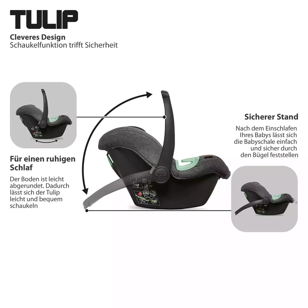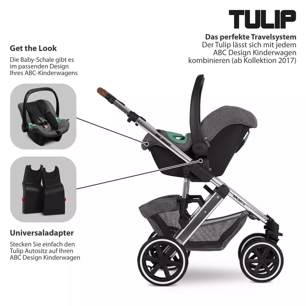 Die Babyschale ABC Design Tulip Diamond Asphalt bietet i-Size (R129) Sicherheit und optimalen Seitenaufprallschutz für Kinder ab Geburt bis 13 kg. Der Autositz Gruppe 0+ verfügt über eine höhenverstellbare Kopfstütze und ein 3-Punkt-Gurtsystem, das sich individuell anpassen lässt. Der herausnehmbare Neugeborenen-Einsatz und das individuell anpassbare Sitzpolster sorgen für Komfort und Halt. Die Babyschale ist kompatibel mit vielen ABC Design Kinderwagenmodellen und lässt sich mit optionalen Adaptern als Travelsystem nutzen.