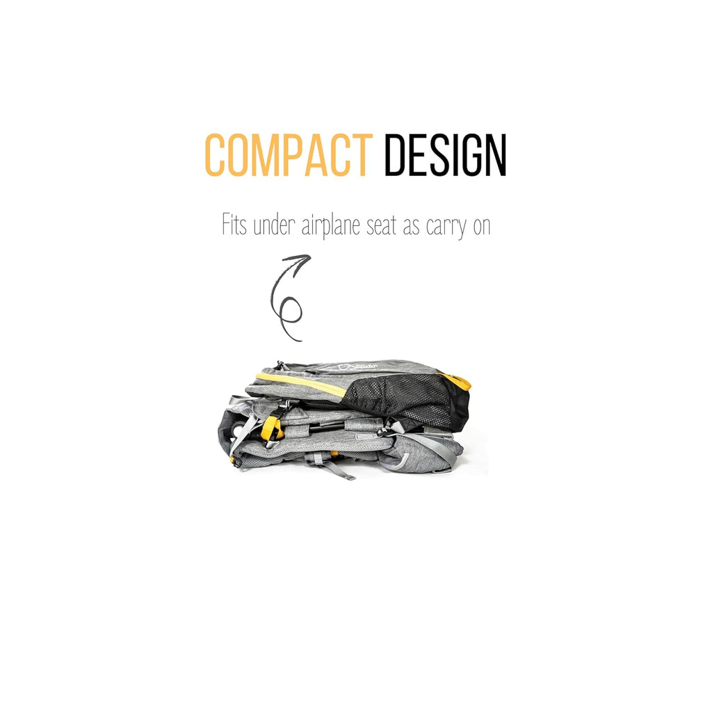 1.The unique design of this shoulder carrier allows everyone in the family, parents and kids, to capture every second of your trip, no matter it is the beautiful scenery of nature, or the cute polar bear in the zoo. 2.Unlike traditional strollers, this hands-free design gives your hands a break until they are needed in many situations like this one. Perfect for the airport, when you need to push your luggage while chasing after your kids. 3.OE carrier is 4.4 lbs with the backpack on and 3.4 lbs without the backpack, much lighter than most of the back carriers on the market. It can support child up to 45 lbs. It is the ideal baby carrier for families that have multiple children. 4.Unlike other shoulder carriers, OE carrier is designed with hip support to free your neck and shoulders from feeling sore and painful. Because most of the weight is distributed to your waist. So that you can hike with your child for 2 hours without feeling the need of a neck/shoulder massage afterwards. 5.You can bring an OE carrier on a plane as a carry-on and tuck it underneath the seat because it is super compact. And you can carry it like a regular backpack when folded.
