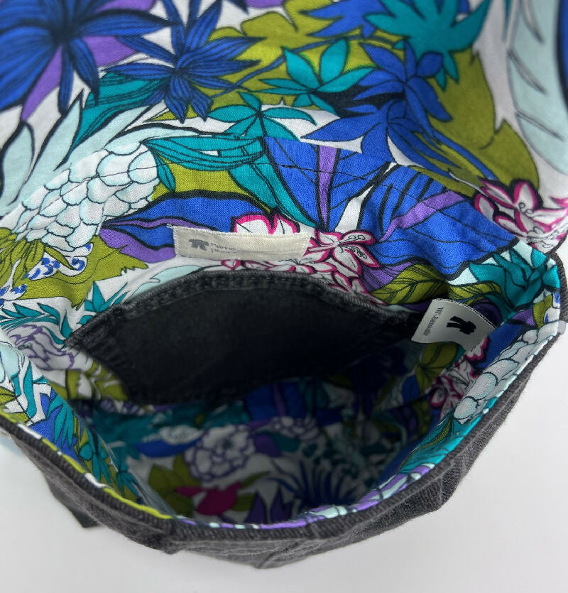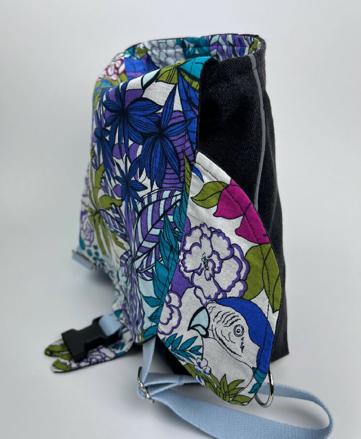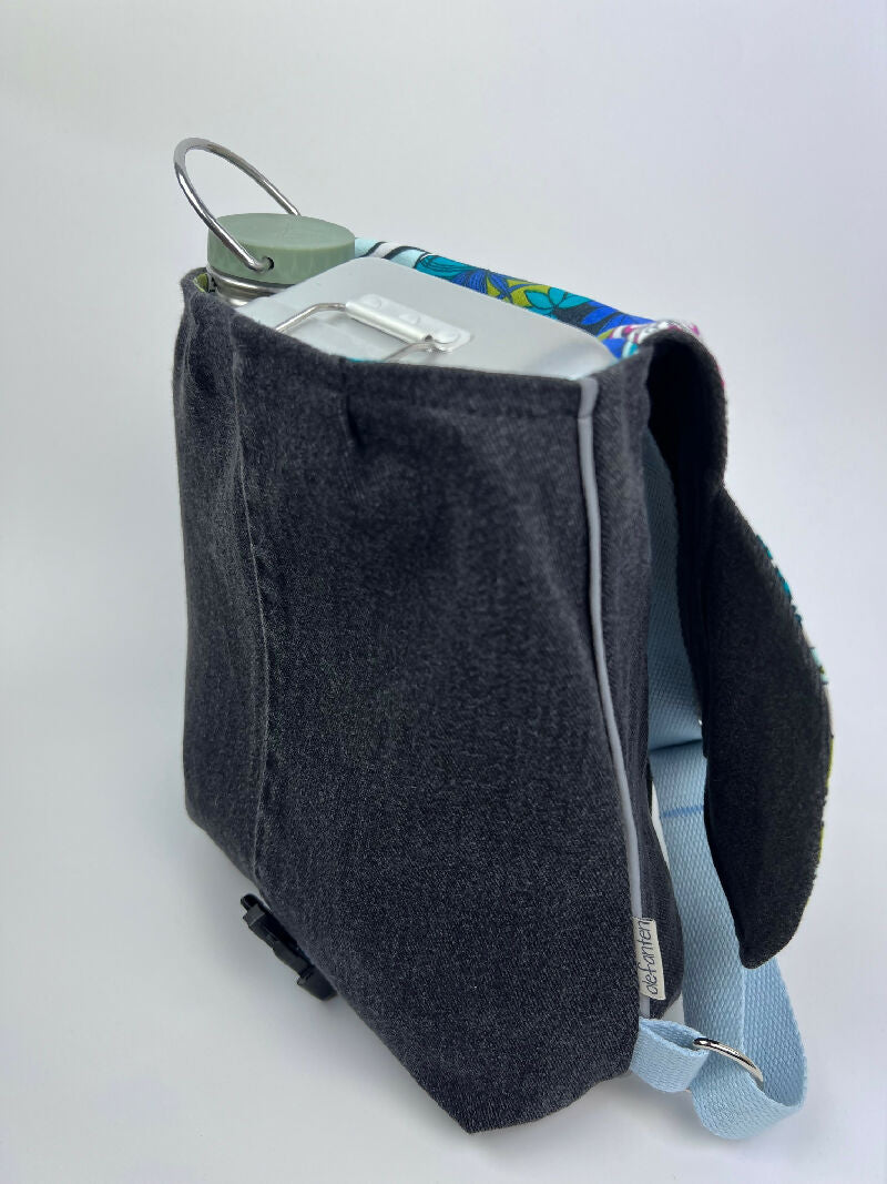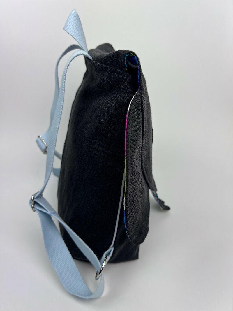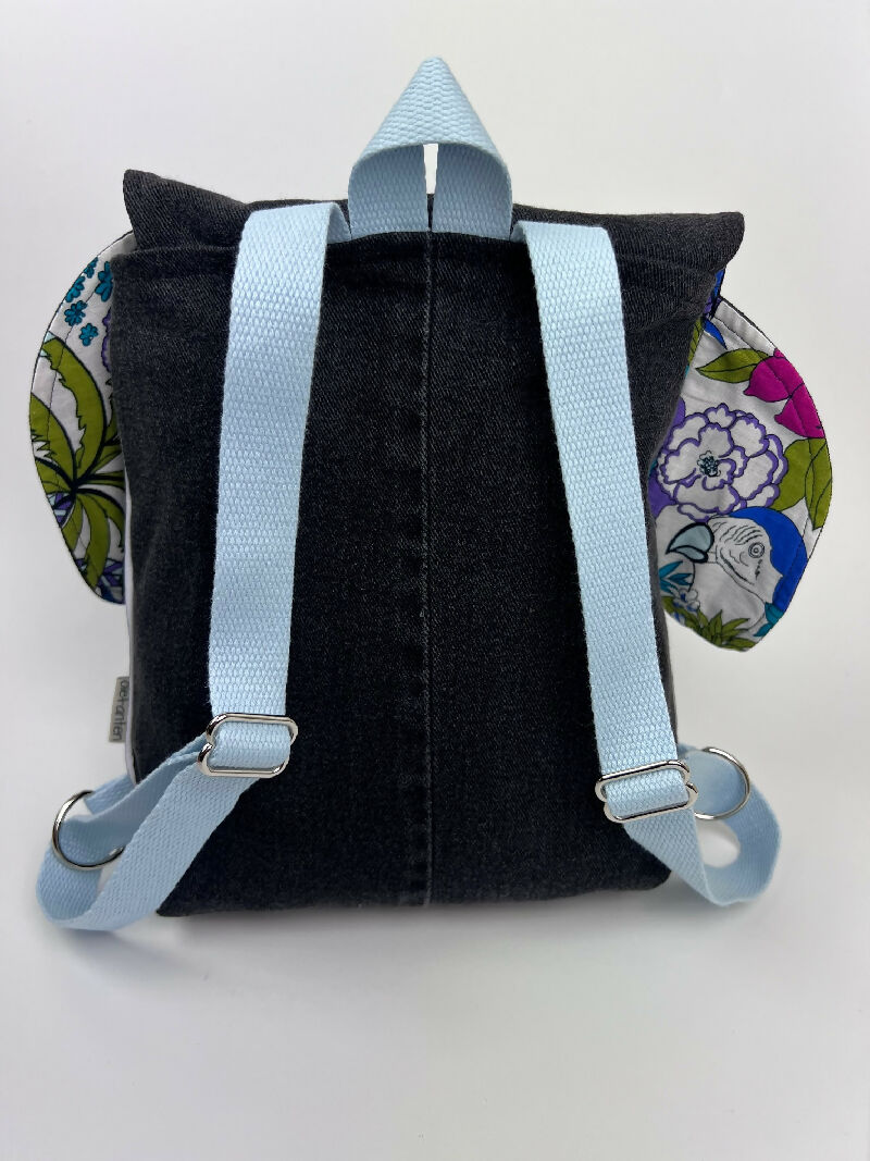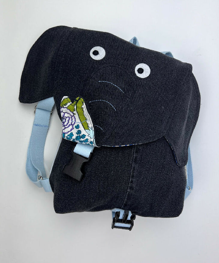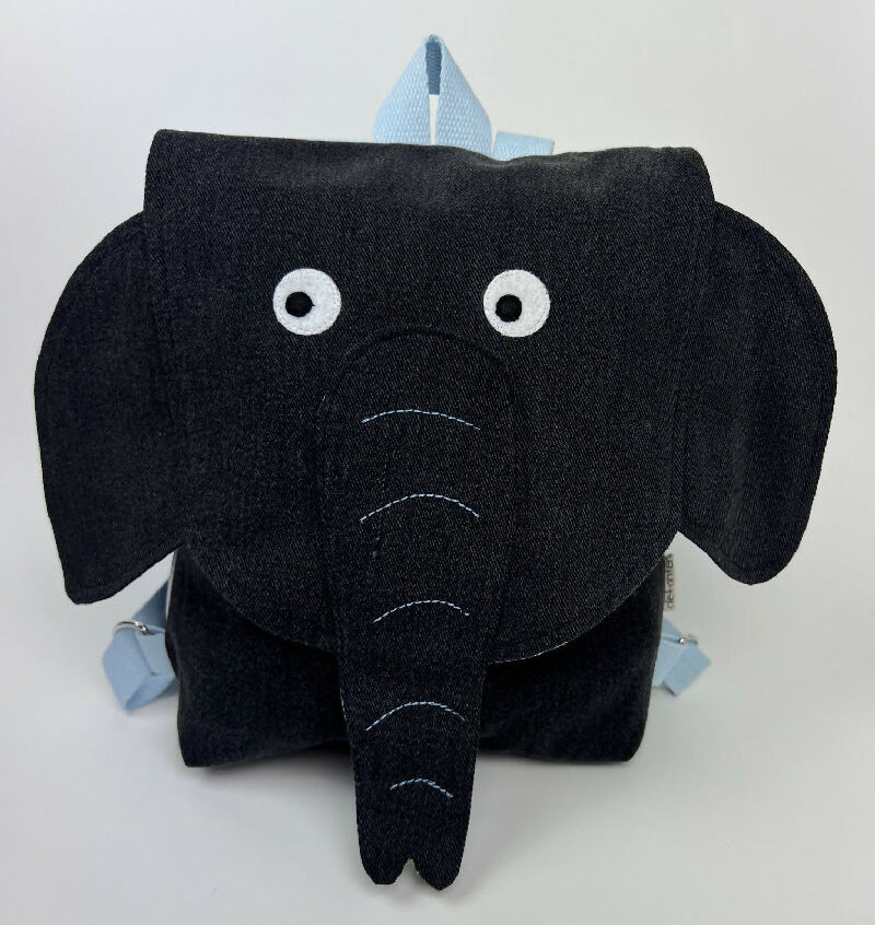 Kinderrucksack aus einer schwarzen Jeans mit Innentasche und verstellbaren Gurten und einem Futter im Dschungellook. An den Seiten wurde ein Reflex-Paspelband zur besseren Sichtbarkeit im Dunkeln eingearbeitet. Der Rucksack wird mit einer Steckschnalle verschlossen, die sich sehr einfach von Kinderhänden öffnen und schließen lässt. Olefanten Rucksäcke sind schön handlich und eignen sich perfekt für die Kita oder den Kindergarten.