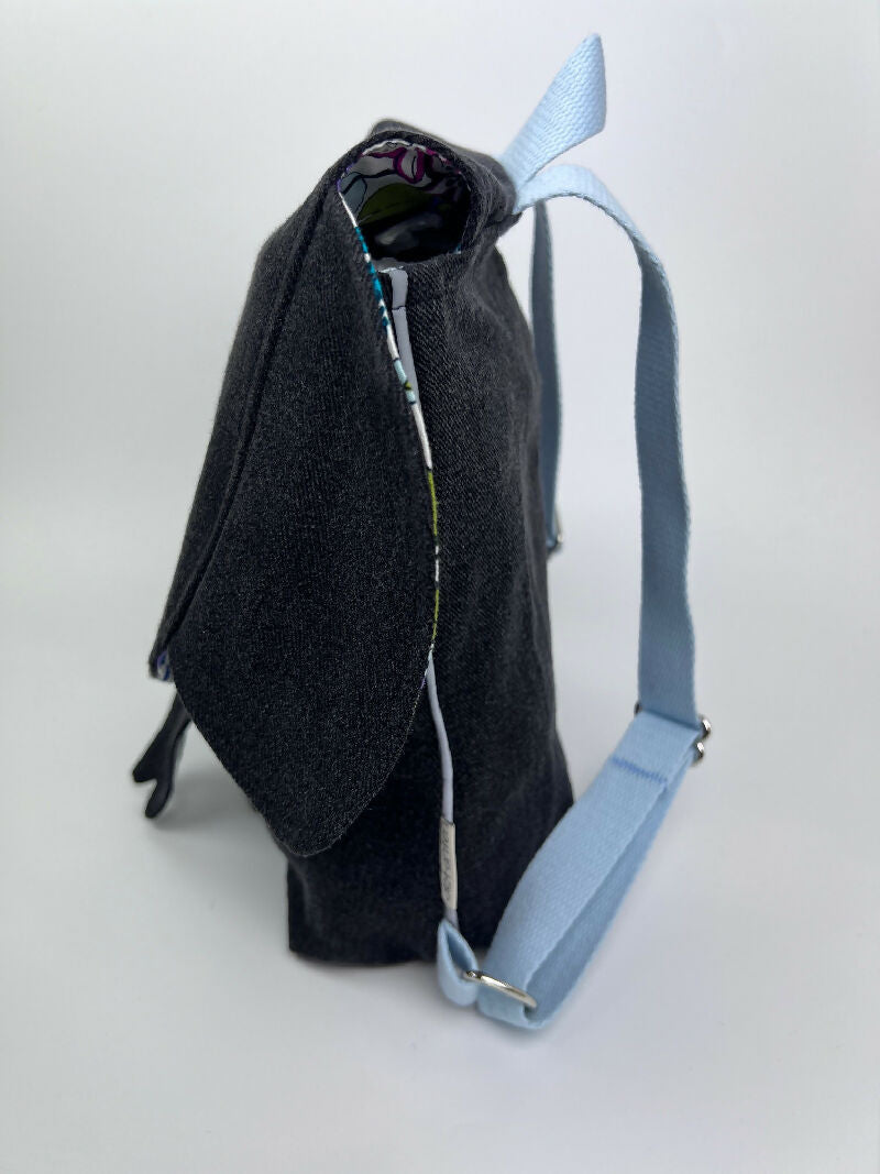 Für die Aufhänger und Tragegurte wurden Baumwollband und Metallringe/-schnallen verarbeitet. Eine Steckschnalle aus recyceltem Kunststoff verschließt den Rucksack. Die Augen bestehen aus Filz und die Rucksackklappe wurde mit einer Bügeleinlage aus Baumwolle verstärkt.