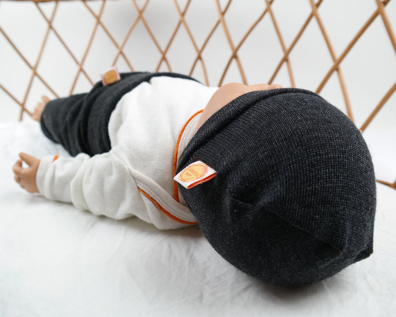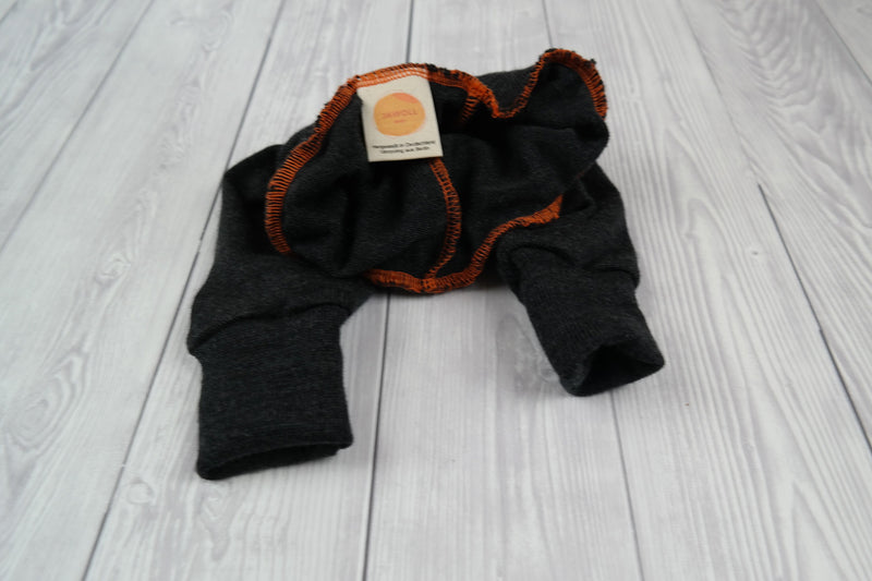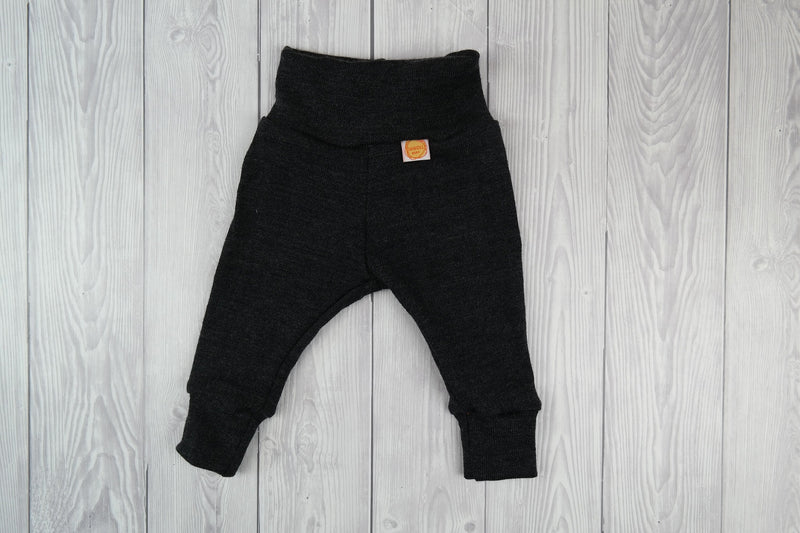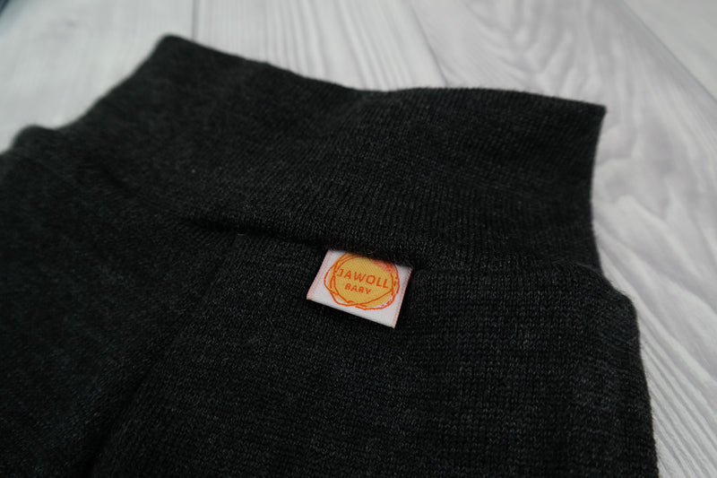 Da Merinowolle dehnbar und der Schnitt eher locker ist, kann das Set lange getragen werden. Durch das Umklappen der Beinbündchen ist die Hose mitwachsend. In der Hose ist genug Platz für alle Windelarten.
