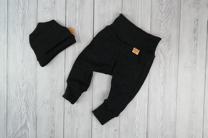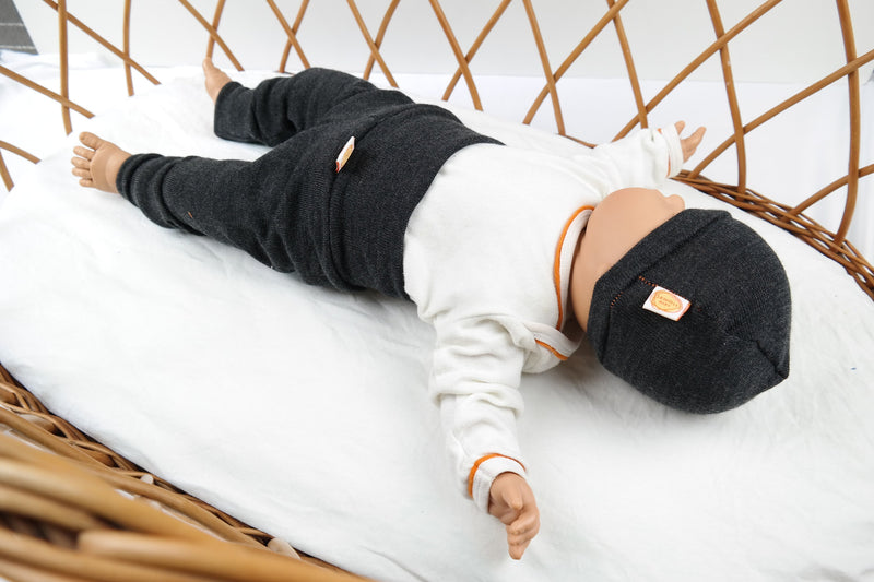 Set bestehend aus Hose und Mütze für Neugeborene aus Merinowolle, genäht aus einem geretteten Wollpullover. Die Stoffqualität ist angenehm leicht und damit ideal für Frühling und Sommer.