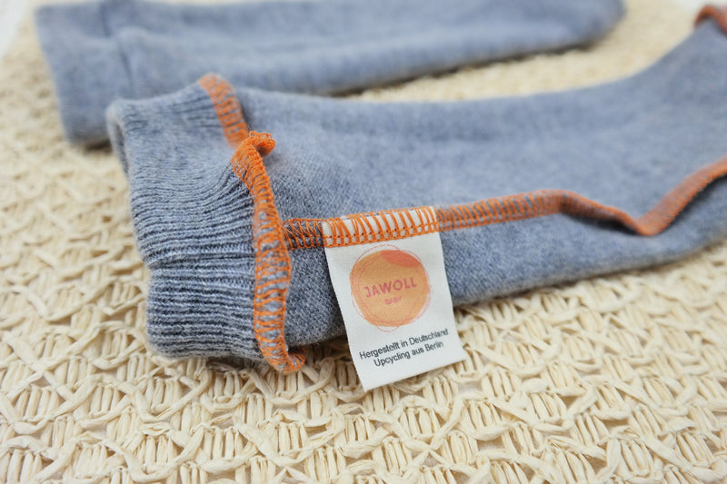 Durch Upcycling rettet Jawoll Baby das wertvolle Material Wolle und macht es wieder nutzbar, hier als wärmende Stulpen für Herbst und Winter.