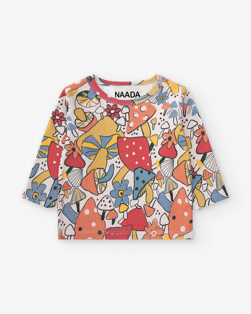 Bio Baumwoll Baby T-Shirt mit Flying Mushrooms Stamping. Dieser Druck ist inspiriert von New Yorks Pop Art. Das T-Shirt nimmt eine Öffnung mit zwei Automatik auf der linken Schulter.