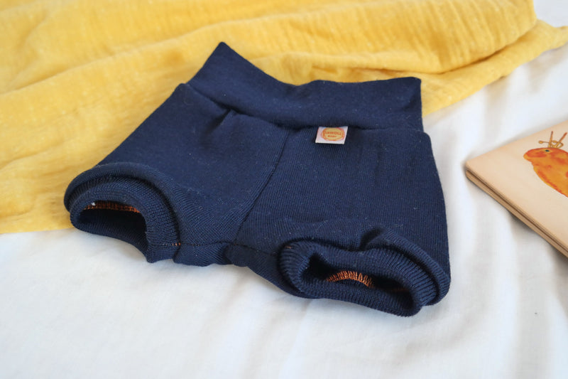 Da die Wolle dehnbar und der Schnitt eher locker ist, kann die Hose lange getragen werden. In der Hose ist genug Platz für alle Windelarten.