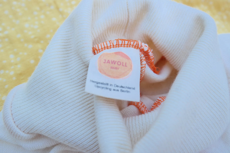 Der orange Faden von Jawoll Baby: Wolle ist biologisch abbaubar – Garn aus Polyester nicht. Ist dieser Nutzungszyklus des Textils zu Ende, siehst du durch die orangen Nähte auf den ersten Blick, wo du Faden und Wolle trennen und damit ein Recycling ermöglichen kannst. Denn nur getrennte Materialien sind über den Hausmüll recycelbar.