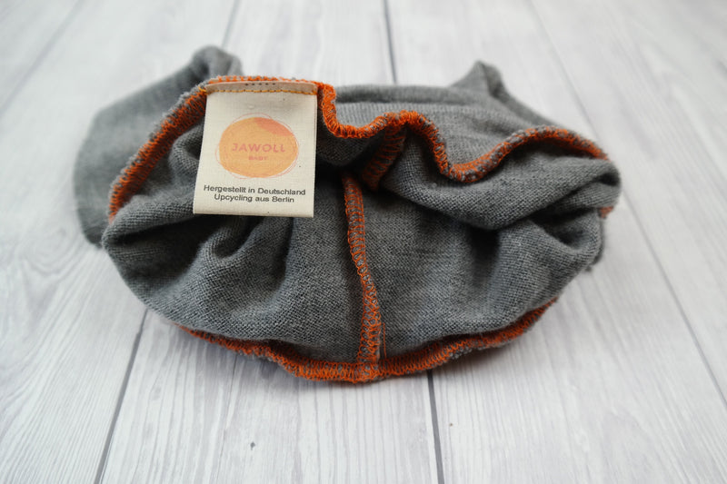 Der orange Faden von Jawoll Baby: Wolle ist biologisch abbaubar – Garn aus Polyester nicht. Ist dieser Nutzungszyklus des Textils zu Ende, siehst du durch die orangen Nähte auf den ersten Blick, wo du Faden und Wolle trennen und damit ein Recycling ermöglichen kannst. Denn nur getrennte Materialien sind über den Hausmüll recycelbar.