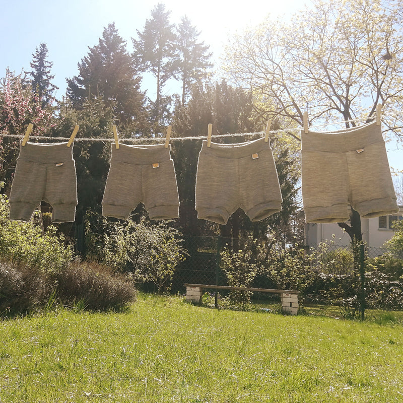 Da die Wolle dehnbar und der Schnitt eher locker ist, kann die Hose lange getragen werden. Der breite Bund macht sie mitwachsend. In der Hose ist genug Platz für alle Windelarten. Im Winter kann man sie mit einer Strumpfhose kombinieren.