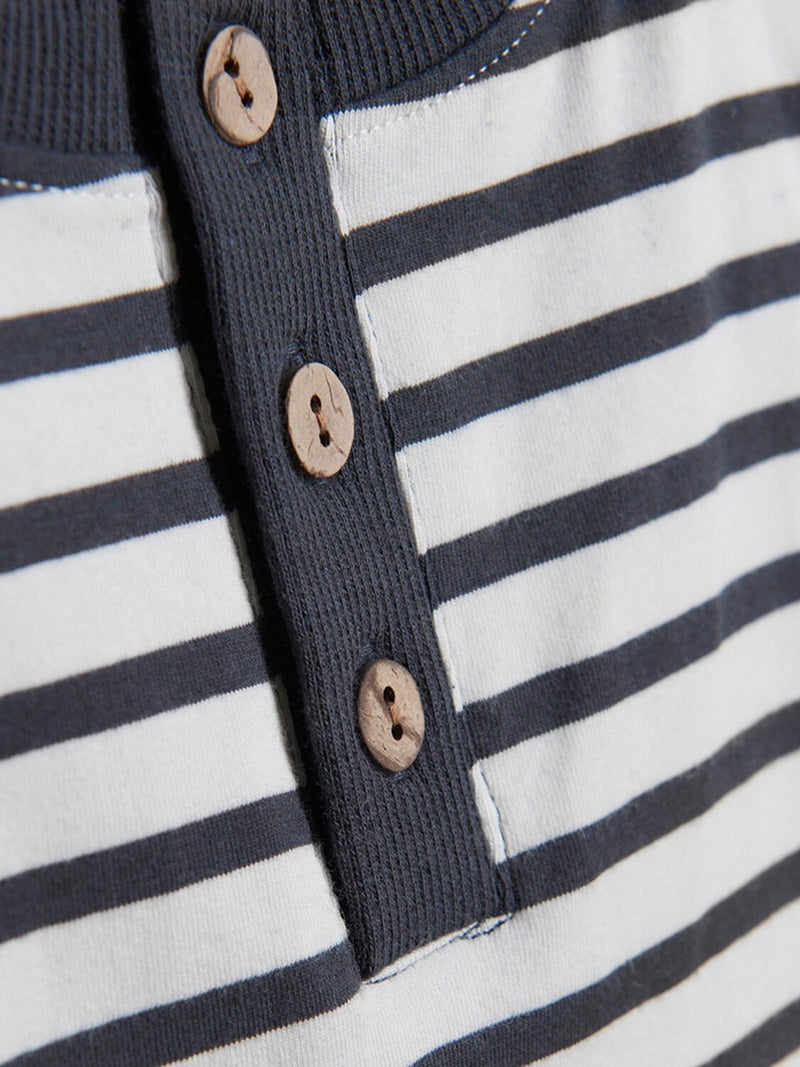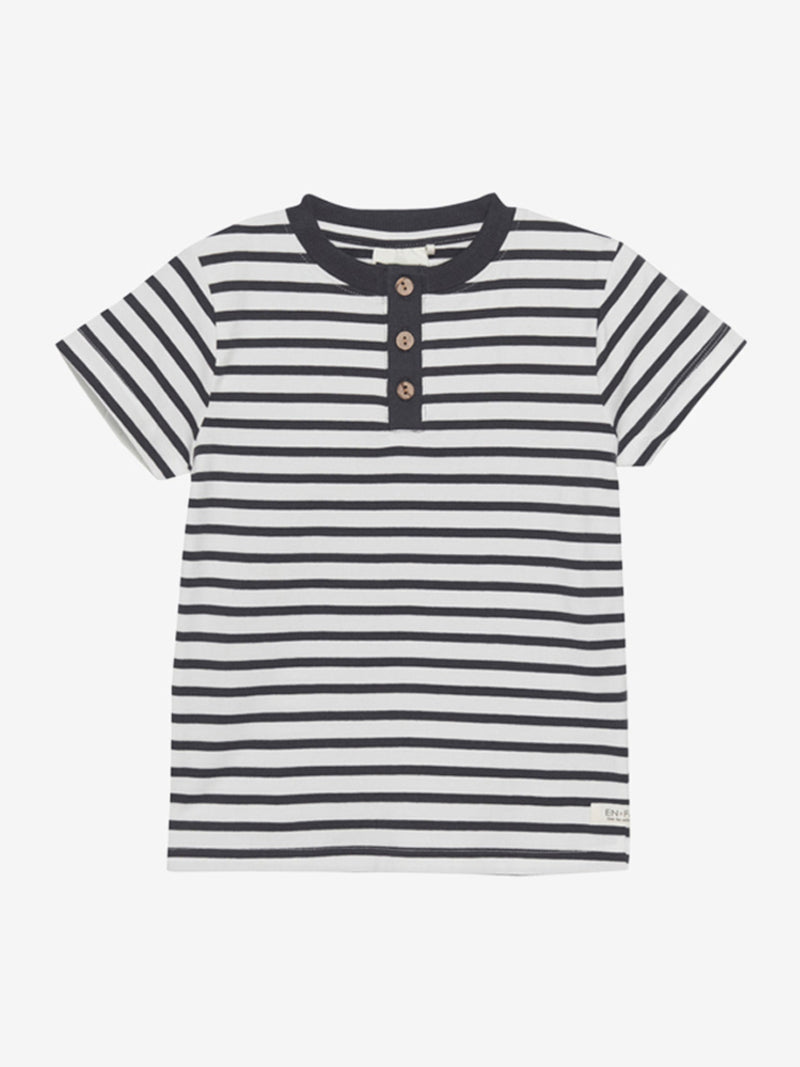 Cooles allover bedrucktes T-Shirt von EN FANT. Das T-Shirt mit Streifenprint hat Knöpfe auf der Vorderseite, es ist aus weichem Material, das angenehm zu tragen ist.