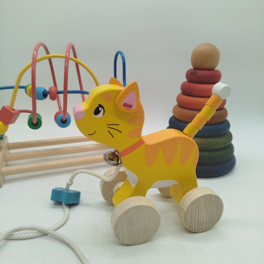 Hol dir das liebevoll gestaltete Holzspielzeug-Set mit drei Klassikern für kleine Entdecker! Die Motorikschleife mit bunten Perlen, der farbenfrohe Stapelturm und das gelbe Ziehtier in Katzenform sorgen für abwechslungsreichen Spielspaß und fördern Feinmotorik sowie Koordination. Verpackung fehlt, die Spielzeuge sind in sehr gutem gebrauchten Zustand. Gib diesen nachhaltigen Holzspielzeugen ein neues Zuhause und bring Bewegung ins Kinderzimmer! Hinweis: Nicht für Kinder unter 3 Jahren geeignet, da Kleinteile verschluckt werden können.