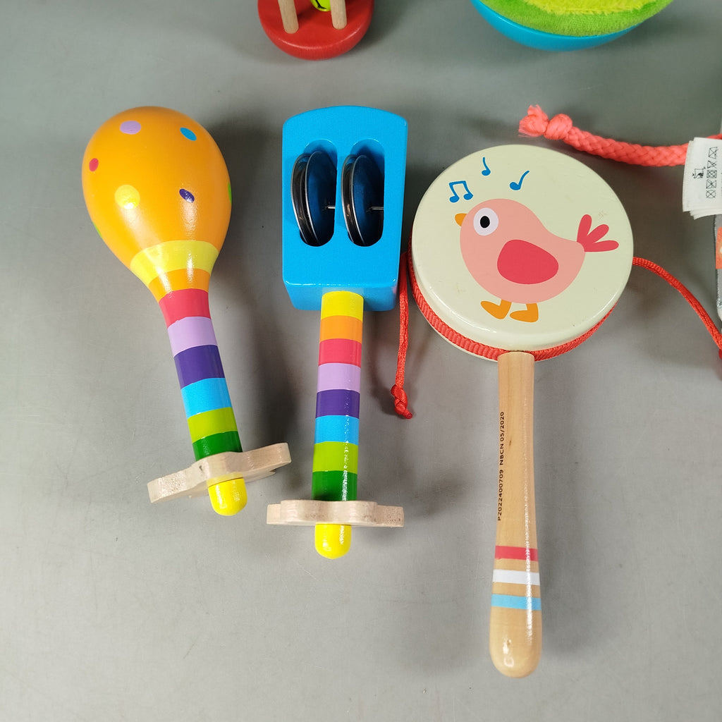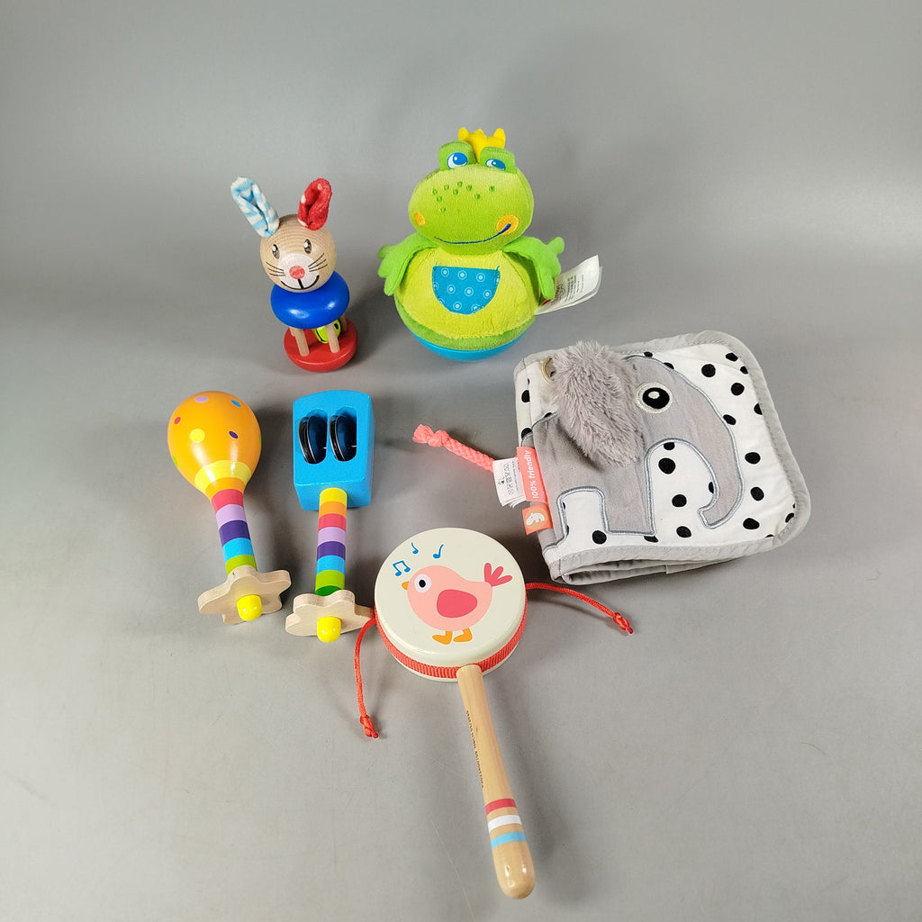 Hol dir das liebevoll zusammengestellte Babyspielzeug-Set mit einem weichen Stoffbuch von done by deer und mehreren Holzspielzeugen von Selecta. Enthalten sind eine Maracas, eine Kastagnette, eine Trommelrassel und eine Hasenrassel. Die Spielzeuge fördern die motorische Entwicklung und laden zum Entdecken ein. Das Set ist gebraucht, befindet sich in sehr gutem Zustand, die Originalverpackung fehlt. Gib diesen hochwertigen Spielsachen ein neues Zuhause und schenke ihnen eine zweite Spielrunde.