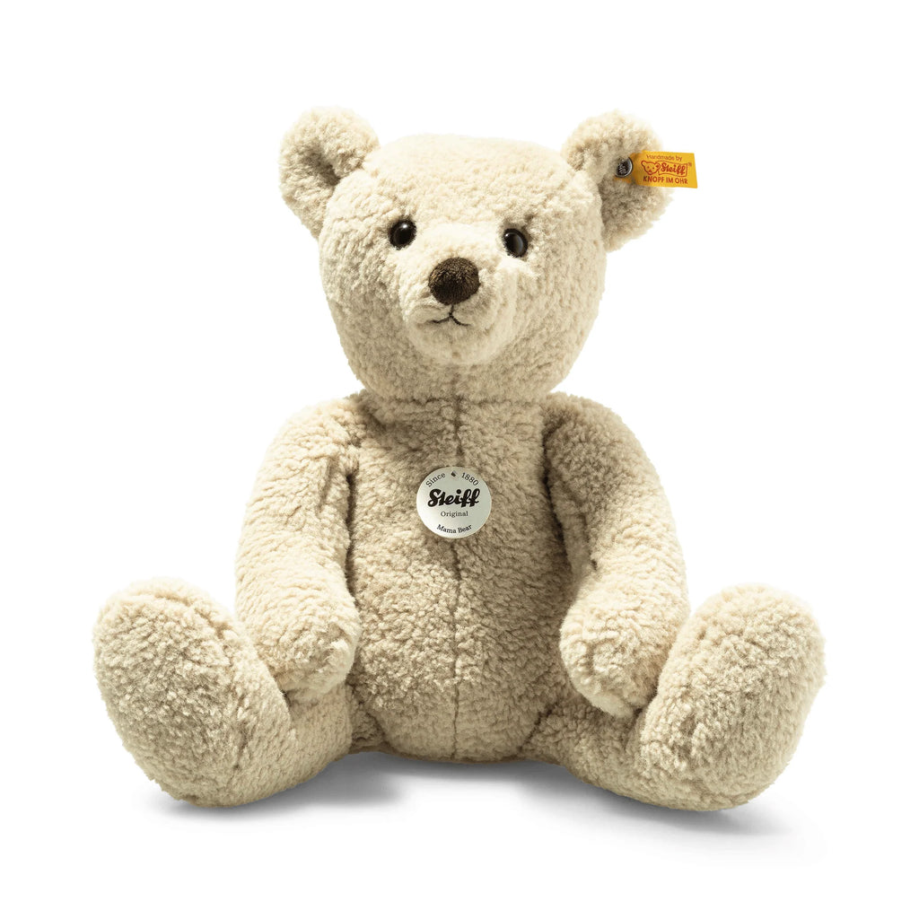 Kuscheltier Mama Bär von Steiff ist die sanfte und liebevolle Anführerin der „120 Jahre Teddybär“-Bärenbande! Mit ihrer Größe von ca. 36 cm, ihrem kuschelweichen, beigefarbenen Teddyfleece und den abgesetzten Pfoten und Füßen ist Mama Bär der perfekte Kuschelpartner. Sie bringt mit ihren ausdrucksstarken Nähten und ihrem persönlichen Brustschild viel Charakter mit. Der klassische Edelstahl „Knopf im Ohr“ macht sie unverwechselbar als ein hochwertiges Steiff-Kuscheltier.