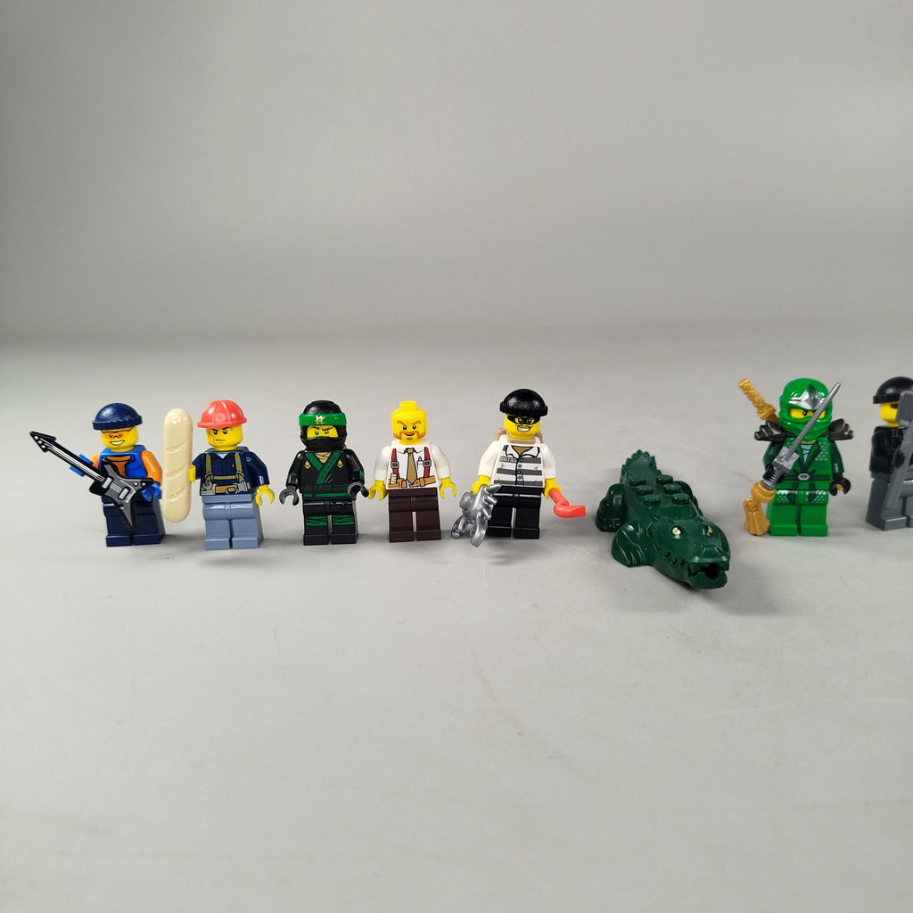 Hol dir das LEGO Figuren-Set mit 9 detailreichen Minifiguren und einer grünen Tierfigur, die einem Krokodil ähnelt. Einige Figuren tragen Zubehör wie Schwerter, Speere und Werkzeuge – perfekt für kreative Abenteuer in deiner LEGO Welt. Alle Figuren bestehen aus originalen LEGO Teilen. Die Verpackung fehlt, aber der Zustand ist sehr gut erhalten. Gib diesen beliebten LEGO Figuren ein neues Zuhause und erweitere deine Sammlung! Achtung: Nicht für Kinder unter 3 Jahren geeignet, da Kleinteile verschluckt werden können.