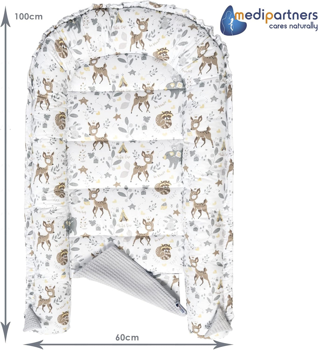 Medi Partners Babynest Nestchen für Neugeborene - 100x60x15 Babynestchen Baby zweiseitg Nest Bett 100% Baumwolle Waffel Kuschelnest tragbar (REH mit Grauer Waffel)