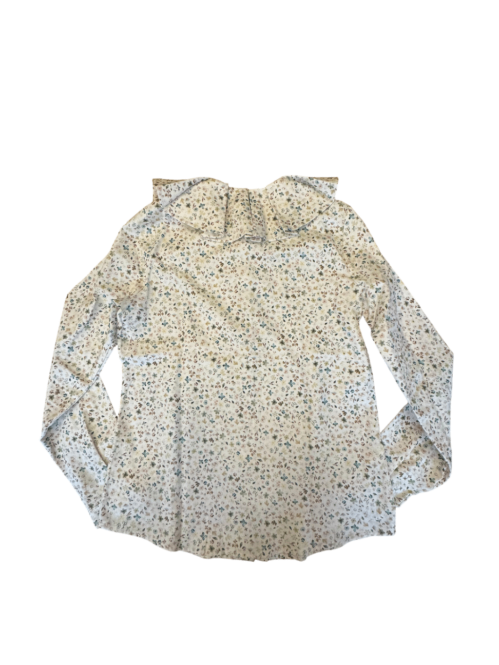 Elegante Mädchen-Secondhand-Bluse mit Blumenmuster. Das Modell mit Rüschen am Kragen verleiht jedem Outfit einen stilvollen Look, perfekt für Alltag und besondere Anlässe.