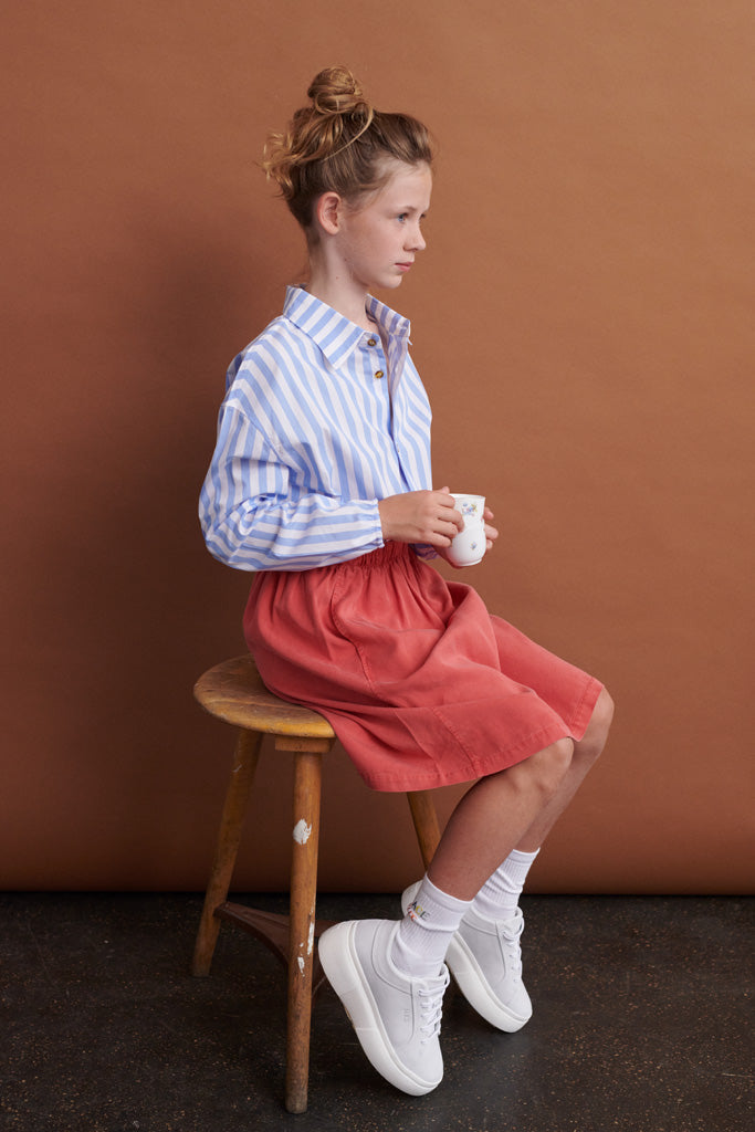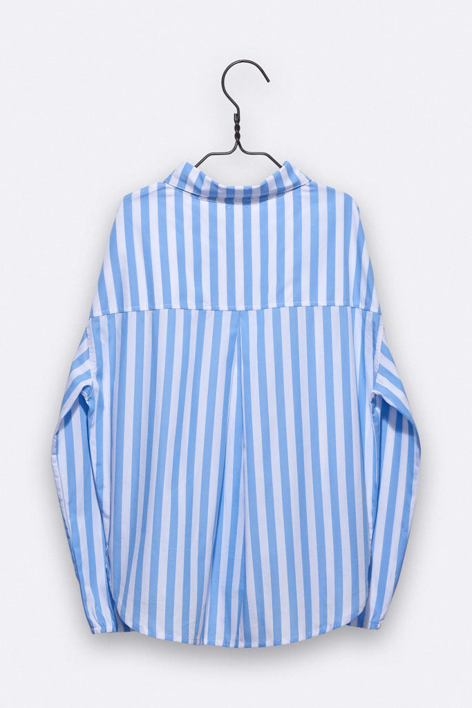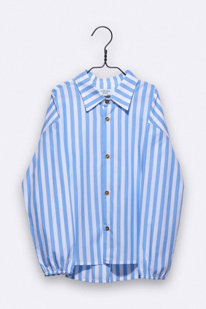 Die Eva Bluse ist aus hellblau/weiss gestreifter Bio-Baumwolle gefertigt und hat einen lockeren, schmeichelnden Schnitt.