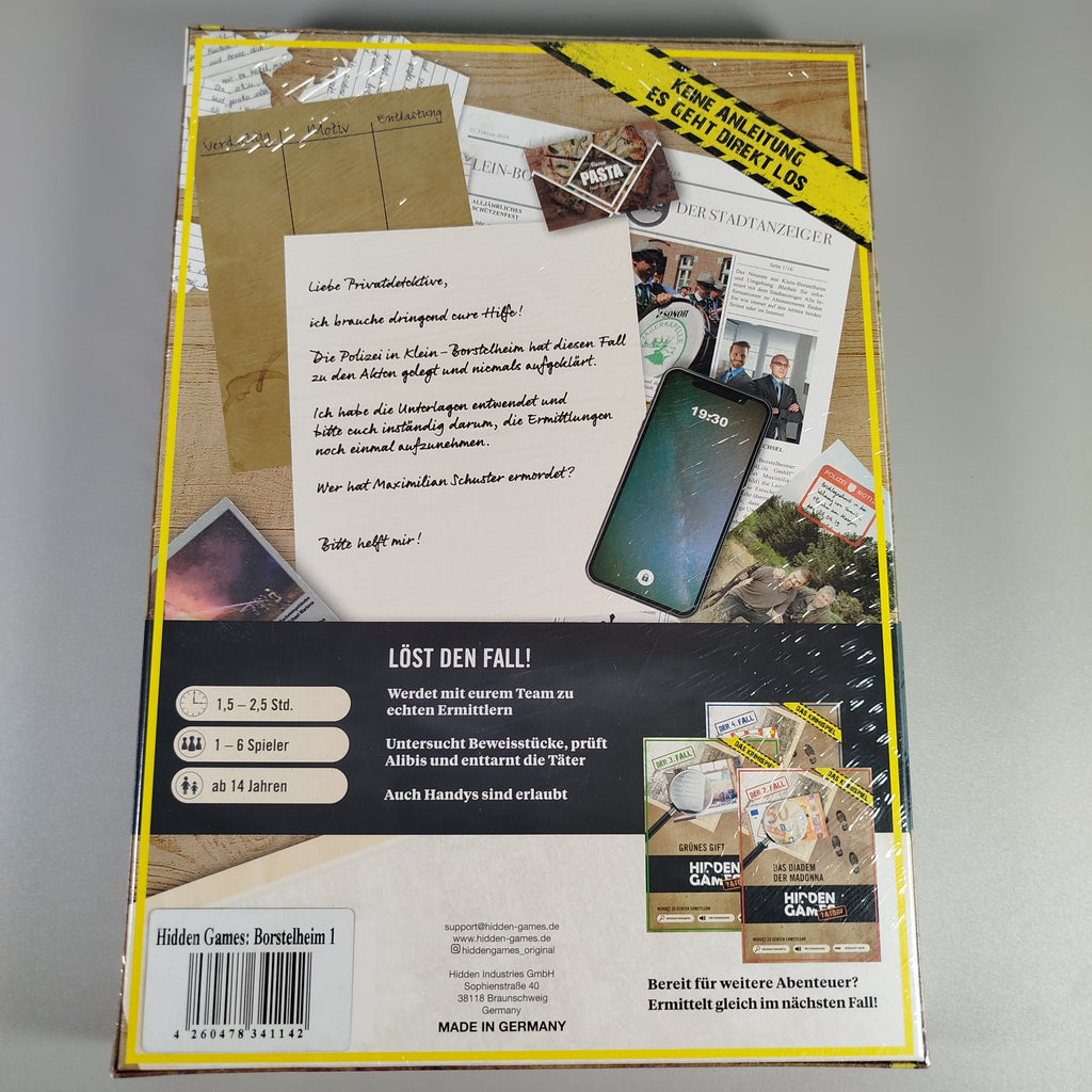 Hol dir das Krimispiel 'Der Fall Klein-Borstelheim' von Hidden Games und werde zum echten Ermittler! Dieses spannende Detektivspiel entführt dich in einen fesselnden Kriminalfall, den es gemeinsam im Team zu lösen gilt. In der Rolle echter Ermittler suchen die Spieler nach Spuren, befragen Verdächtige und entlarven schließlich den Täter. Das Spiel eignet sich hervorragend für einen spannenden Abend mit Freunden oder der Familie. Es enthält alles, was zum Lösen des Falls benötigt wird, inklusive 5 Fällen mit kniffligen Rätseln. In der Originalverpackung und perfekt für alle, die Geheimnisse lieben. Sicherheitshinweis: Empfohlen ab 14 Jahren. Nicht geeignet für Kinder unter 36 Monaten, da Kleinteile verschluckt werden können. Maße der Verpackung: ca. 20 x 30 x 5 cm. Gib diesem Spiel ein neues Zuhause und erlebe detektivische Abenteuer!
