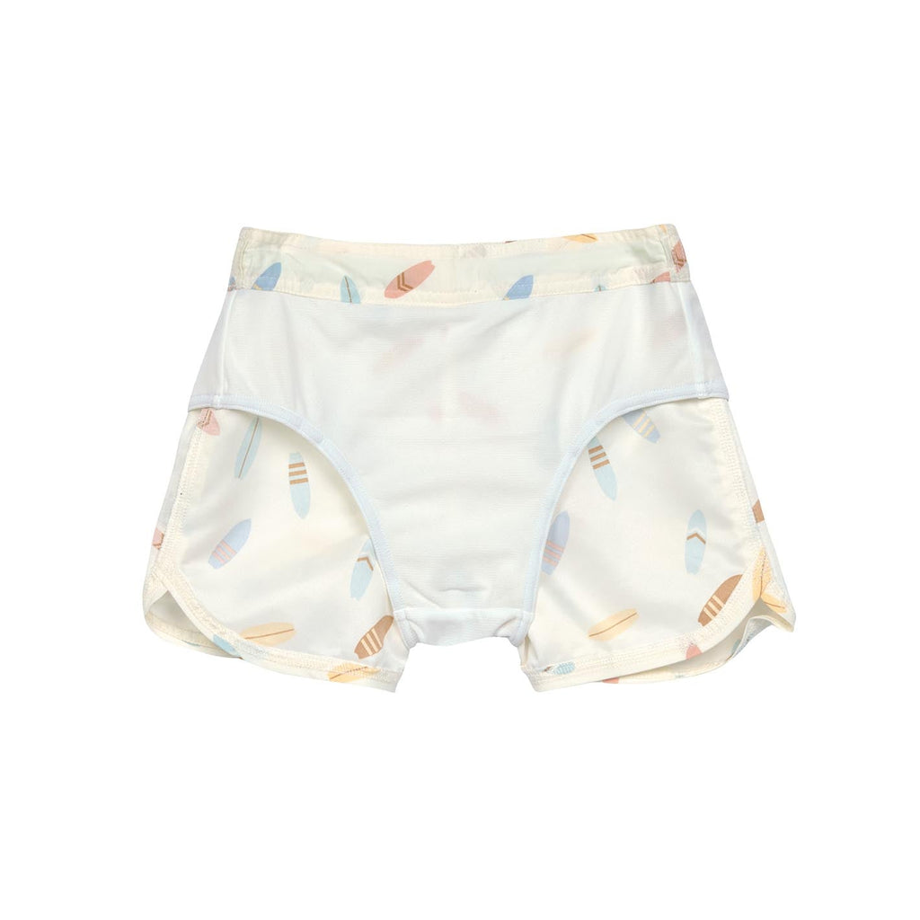 Die weiße Badeshorts für Kids (3 - 6 Jahre) sorgt für einen stylishen Surfer Look auf dem Badeausflug. Der elastische Bindegürtel, der Kordelzug und gerundete Seitenschlitze garantieren ein angenehmes Tragegefühl bei dieser kurzen Badehose.