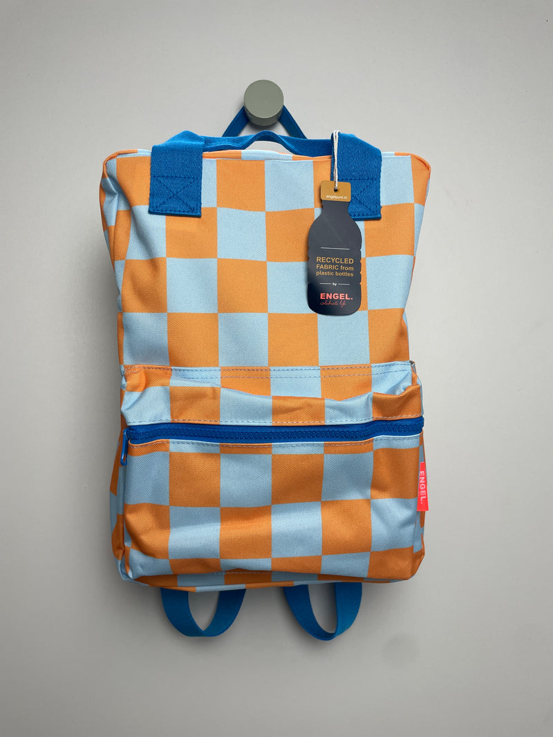 ENGEL. Rucksack Sticky Orange - Groß Reise mit Freude! Gehe mit einem Lächeln auf den Weg mit dieser fröhlichen, robusten blau-orange karierten Tasche! Der Rucksack Sticky Orange Large ist umweltfreundlich und aus recycelten PET-Flaschen hergestellt. Das wasserabweisende Futter in Kombination mit dem robusten und geräumigen Design macht den Rucksack sehr geeignet, um ihn jeden Tag zur Schule oder zur Arbeit mitzunehmen. Eine Laptop passt problemlos zusammen mit anderen Schul- oder Bürobedarf hinein. An der Seite befindet sich ein Fach für eine Trinkflasche, ideal für unterwegs. Auch im Inneren gibt es ein zusätzliches Fach, um Dinge ordentlich zu verstauen. Der Rucksack kann auf dem Rücken getragen werden, hat aber auch robuste Griffe. Die Gurte sind stabil und leicht in der Länge verstellbar. Geeignet für Kinder ab 8 Jahren oder älter. Der Rucksack Sticky Orange ist Teil der Sommerkollektion '25.