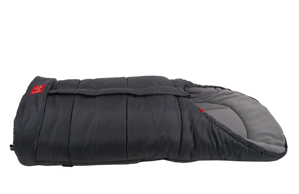 Mittelreißverschluß. Eine Schnalle ist wichtig, um den Fußsack an Ort und Stelle zu halten. Der auf der Rückseite aufgenähte Baumwollstoff soll ein leichtes Verrutschen verhindern.