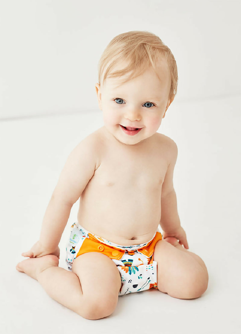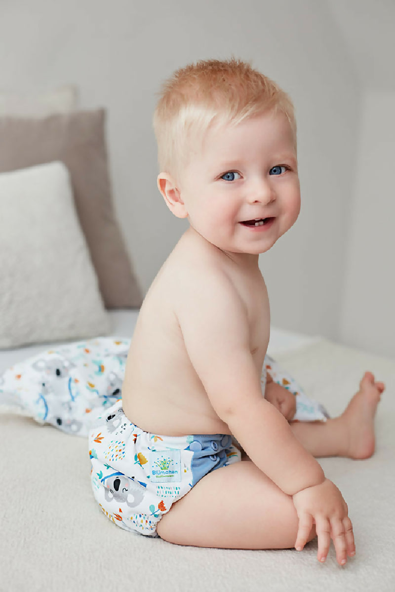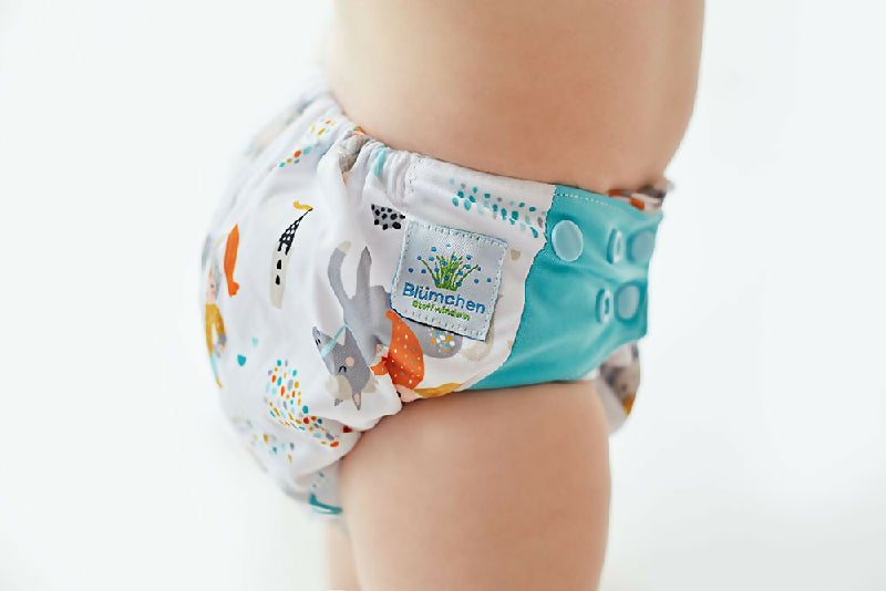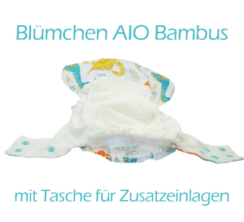 sehr schlanke Ein-Größen-All-in-one mit Bambusfutter. Die Windel ist mit nahtfreien Beinabschlüssen und einem elastischen Auslaufschutz im Inneren der Windel ausgestattet. Beides minimiert hochziehende Feuchtigkeit und bietet den bestmöglichen Auslaufschutz. Nahtfreie Beinabschlüsse bedingen aber einen zusätzlichen Arbeitsschritt beim Wickeln, da man konsequent hervorstehendes Futter unter den wasserdichten Stoff schieben muss. Dieser verschwindet nicht automatisch unter dem PUL. Der doppelte Auslaufschutz im Inneren der Windel ermöglicht besseren Auslaufschutz beim Schlafen und Laufen. Der verdeckt gearbeitete Mikrofaserkern bietet trotz der schlanken Passform eine super Saugleistung.