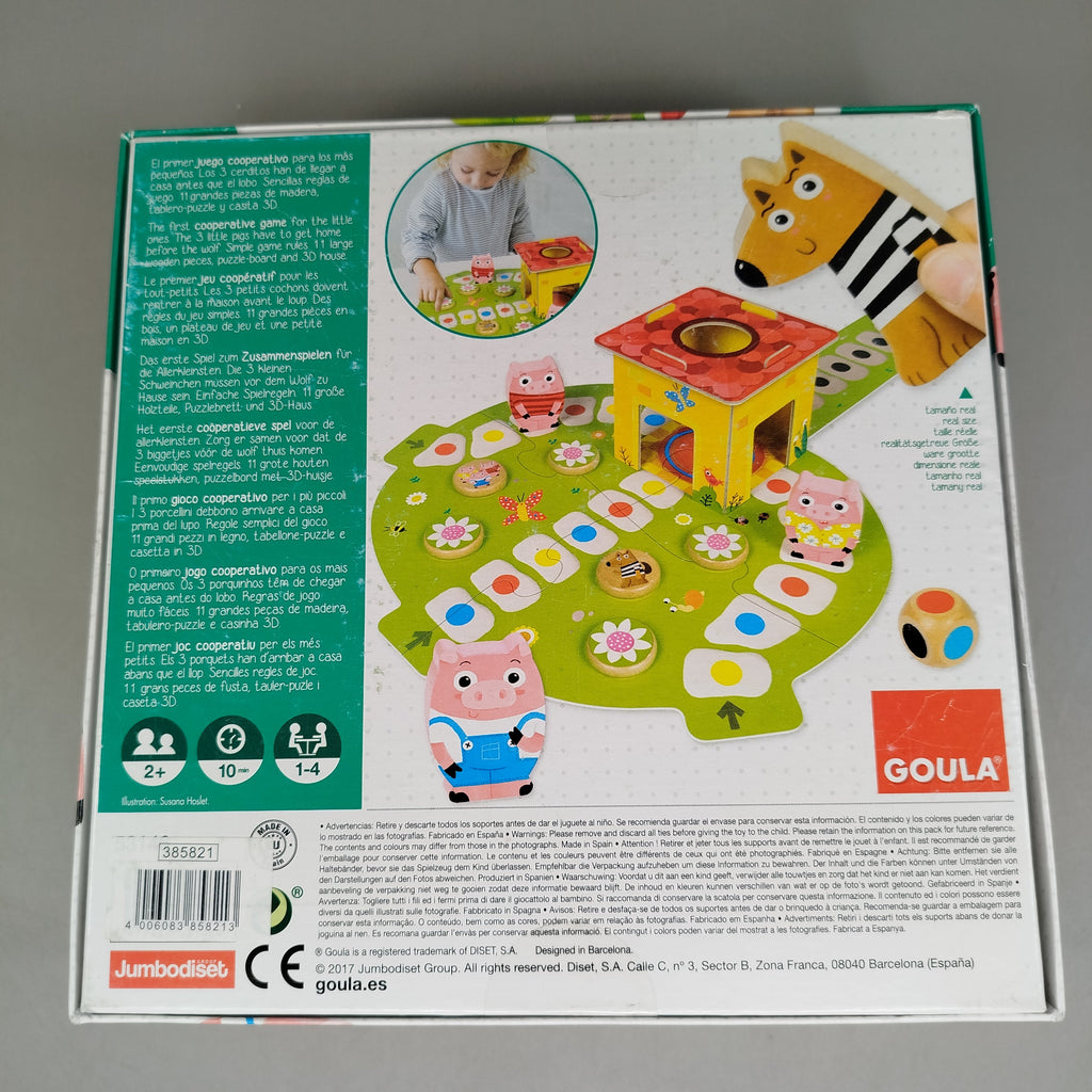 Hol dir das GOULA Brettspiel „3 Little Pigs“ und entdecke ein kooperatives Lernabenteuer für kleine Spieler ab 2 Jahren. Dieses Spiel regt Teamarbeit, Konzentration und Sprachverständnis an und basiert auf dem bekannten Märchen der drei kleinen Schweinchen. Es beinhaltet Spielfiguren, Spielbrett und illustrierte mehrsprachige Anleitung. Das Spiel befindet sich in sehr gutem gebrauchten Zustand, die Verpackung zeigt minimale Gebrauchsspuren. Die Vollständigkeit ist geprüft. Hinweis: Nicht für Kinder unter 2 Jahren geeignet.