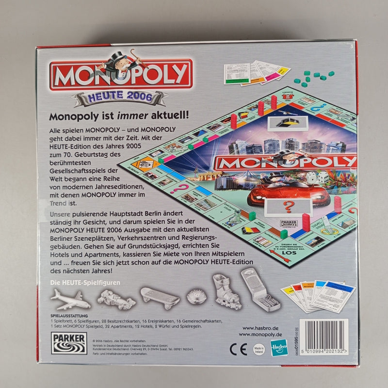 Hol dir das Gesellschaftsspiel Hasbro Monopoly Heute 2006, ein klassisches Brettspiel für 2–6 Spieler, bei dem du Grundstücke handelst und Vermögen aufbaust. Enthalten sind das Spielbrett, eine rote Geldablage aus Kunststoff, Spielgeld, Kartenstapel, mindestens eine Spielfigur in Form eines roten Autos, zwei Würfel sowie mehrere grüne Häuser, alles aufbewahrt in der originalen Spielschachtel. Das Spiel ist gebraucht und macht einen gepflegten Eindruck, sichtbare Schäden sind nicht erkennbar. Ob der Inhalt vollständig ist, kann nicht eindeutig bestätigt werden. Die Originalverpackung ist vorhanden. Mit diesem Second-Hand-Spiel schenkst du einem Klassiker ein zweites Leben und schonst Ressourcen. Geeignet ist das Spiel laut Hersteller ab 8 Jahren; es enthält Kleinteile, daher besteht Erstickungsgefahr. Erkennbare Marken sind Parker und Hasbro.