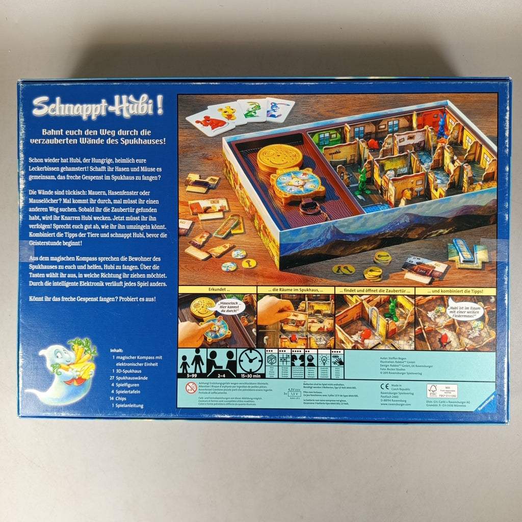Hol dir das spannende Ravensburger Brettspiel ‚Schnappt Hubi!‘, das kreative Spiel mit Elektronik für Kinder ab 5 Jahren. Mit magischem Kompass, Spielbrett, Wänden, Figuren und Chips bietet es Spaß für 2–4 Spieler und dauert etwa 15–20 Minuten. Es gewann das Kinderspiel des Jahres 2012. Das Spiel befindet sich in einem sehr guten gebrauchten Zustand mit leichten Gebrauchsspuren. Verpackung vorhanden, Anleitung fehlt. Gib diesem Spiel ein neues Zuhause und fördere spielerisch Teamgeist und Logik!