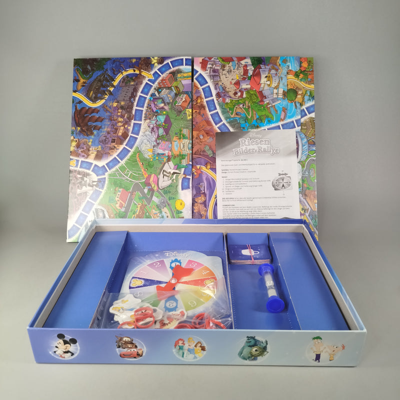 Hol dir das Riesen Bilder-Rallye Brettspiel und tauche ein in eine große, bunte Such- und Spielwelt! Dieses Disney-Themenspiel von Ravensburger begeistert mit einem extra langen, faltbaren Wimmelbild-Spielplan von ca. 1,80 m Länge und sorgt für spannende Spielrunden für 1–6 Spieler mit einer Spieldauer von etwa 15–20 Minuten. Im Lieferumfang enthalten sind der große Spielplan, die Spielanleitung, ein Drehpfeil (Spinner), eine blaue Sanduhr, ein Kartenstapel sowie 6 Figurenaufsteller mit bekannten Charakteren wie Mickey Mouse, Tigger, Arielle, Peter Pan, Lightning McQueen und Sulley sowie mehrere rote Kunststoffringe. Das Spiel fördert Aufmerksamkeit, Konzentration und genaues Hinsehen und ist ideal für gemeinsames Spielen mit der Familie. Gib diesem Spielzeug ein neues Zuhause und schenke ihm ein zweites Leben voller Spielspaß. Das Spiel befindet sich in einem gebrauchten Zustand, der Zustand wurde jedoch nicht näher geprüft. Die Originalverpackung ist vorhanden. Die Vollständigkeit ergibt sich aus dem sichtbaren Lieferumfang. Altersempfehlung ab 4 Jahren. Hinweis gemäß GPSR: Enthält Kleinteile, nicht geeignet für Kinder unter 3 Jahren – Erstickungsgefahr.