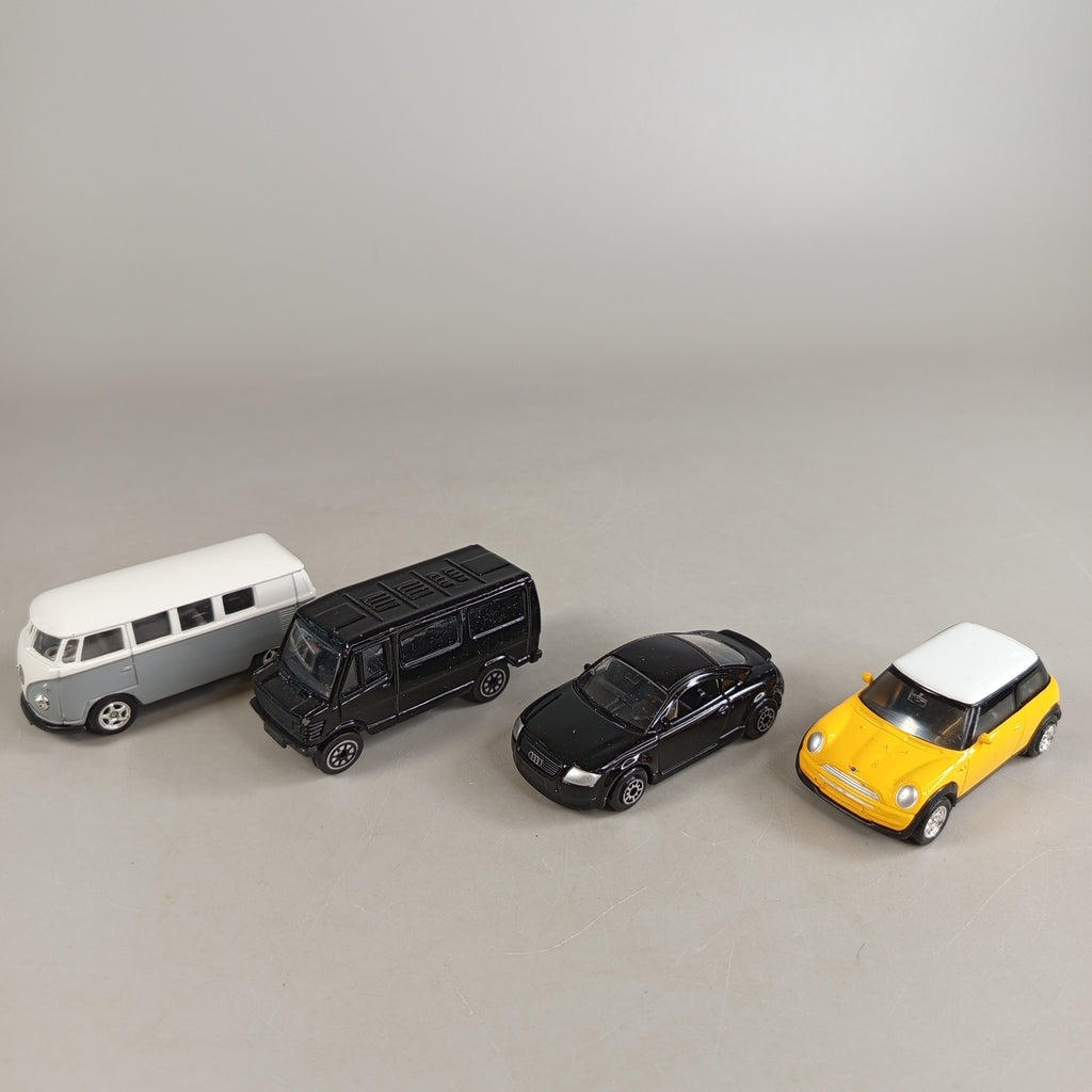 Hol dir das WELLY Modellfahrzeug-Set mit vier detailgetreuen Autos – darunter ein Volkswagen T1 Bus, ein schwarzer Van, ein Audi und ein Mini Cooper. Die Fahrzeuge bestehen aus robustem Metall, sind ca. 7–10 cm groß und laden zum Sammeln oder Spielen ein. Verpackung fehlt, aber die Modelle sind in sehr gutem Zustand mit nur minimalen Gebrauchsspuren. Gib diesen hochwertigen Miniaturen ein neues Zuhause und erfreue dich an ihrem realistischen Design. Sicherheitshinweis: Enthält Kleinteile, nicht für Kinder unter 3 Jahren geeignet.