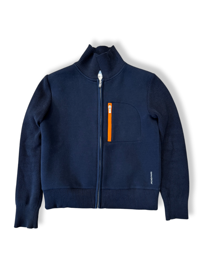 JACADI - Tauche ein in den luxuriösen Komfort dieser marineblauen Strickjacke von Jacadi. Die feine Baumwollmischung bietet exzellenten Tragekomfort und eine moderne Silhouette. Ein leuchtender Akzent wird durch den orangefarbenen Reißverschluss an der Brusttasche gesetzt. Perfekt für lässige Outfits und ein idealer Begleiter in der Übergangszeit. Kombiniere ihn mit Jeans und Sneakers für einen urbanen Look. Ein Must-have für alle, die stilvolle und funktionale Kleidung schätzen.