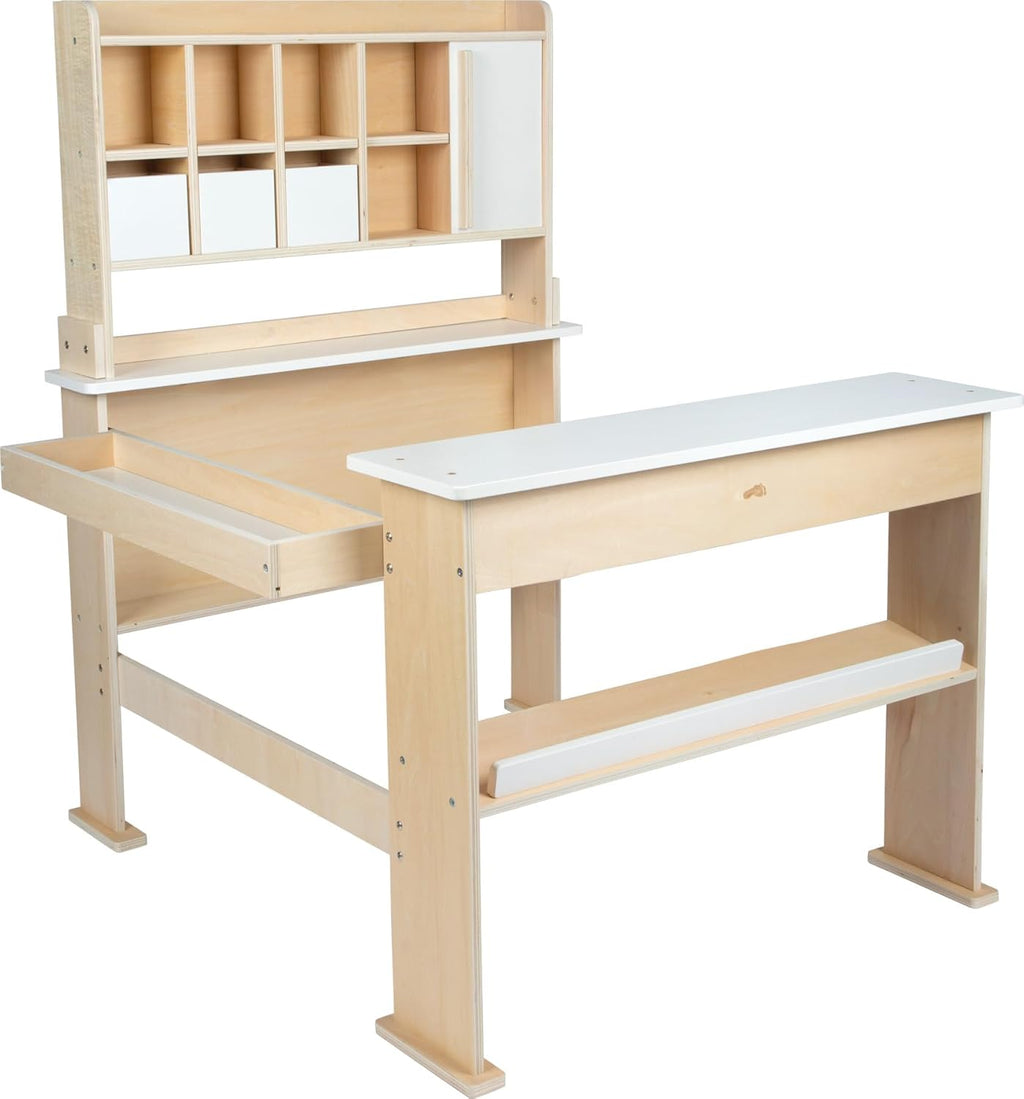 - Moderner Kaufladen aus naturbelassenem Holz in Kombination mit schlichtem Weiß für das kreative Rollenspiel und realitätsnahe Einkaufserlebnis