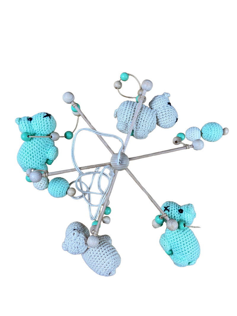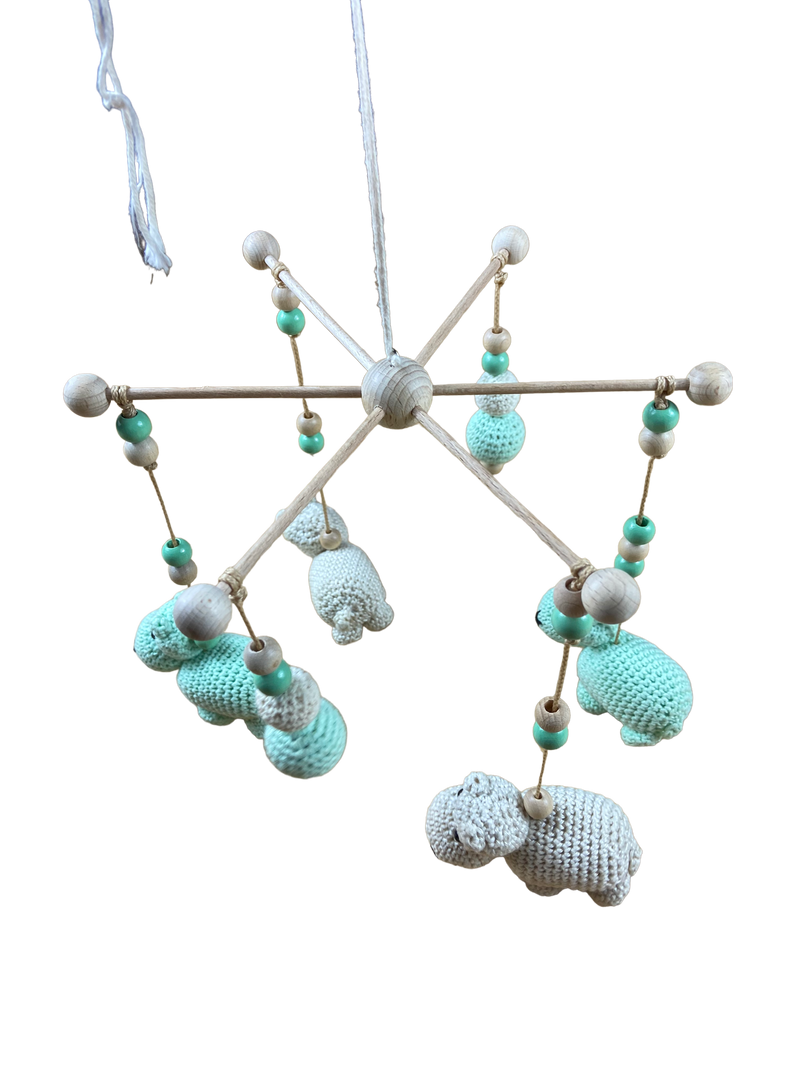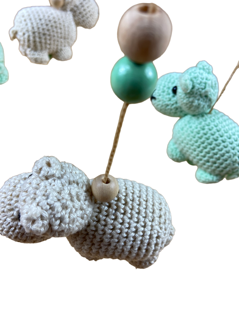 Mobile mit gestrickten Tieren.