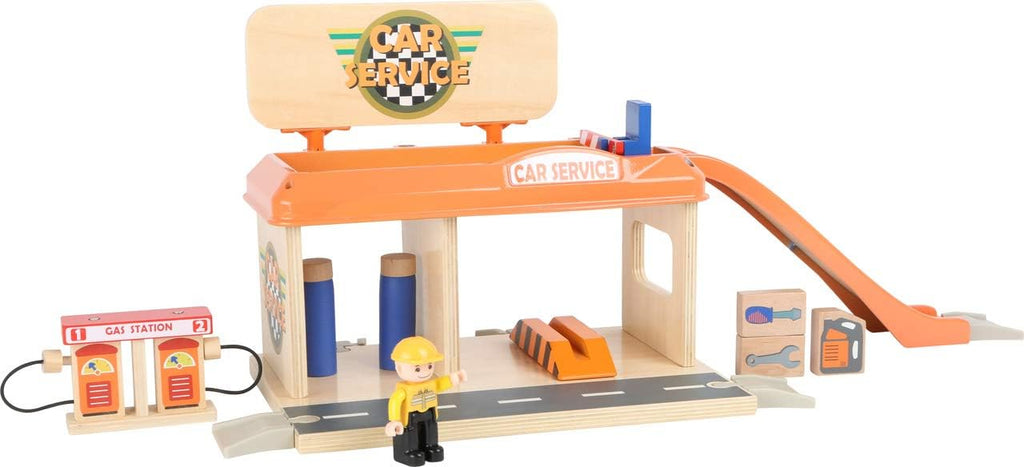 small foot 10901 Autowerkstatt mit Tankstelle aus 100% FSC®-zertifiziertem Holz, inkl. Zubehör, mit Schienen kompatibel