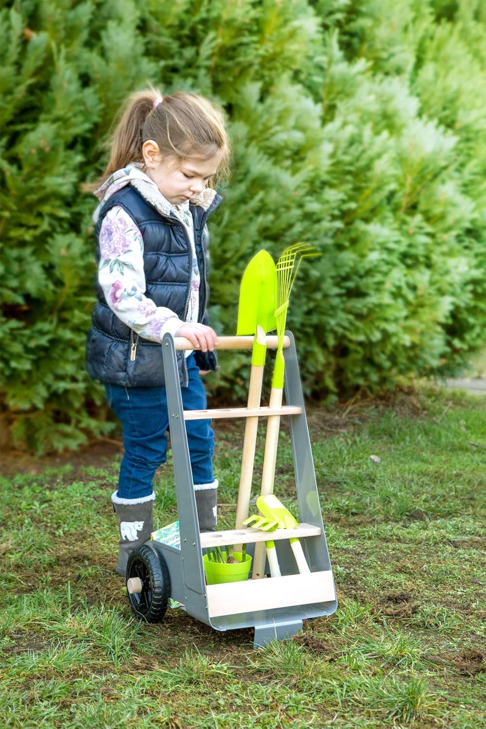 - Der Gerätewagen bietet neben dem vorhandenen Zubehör noch Platz für weitere Gartenwerkzeuge und fördert ganz nebenbei das aktive Rollenspiel der Kinder