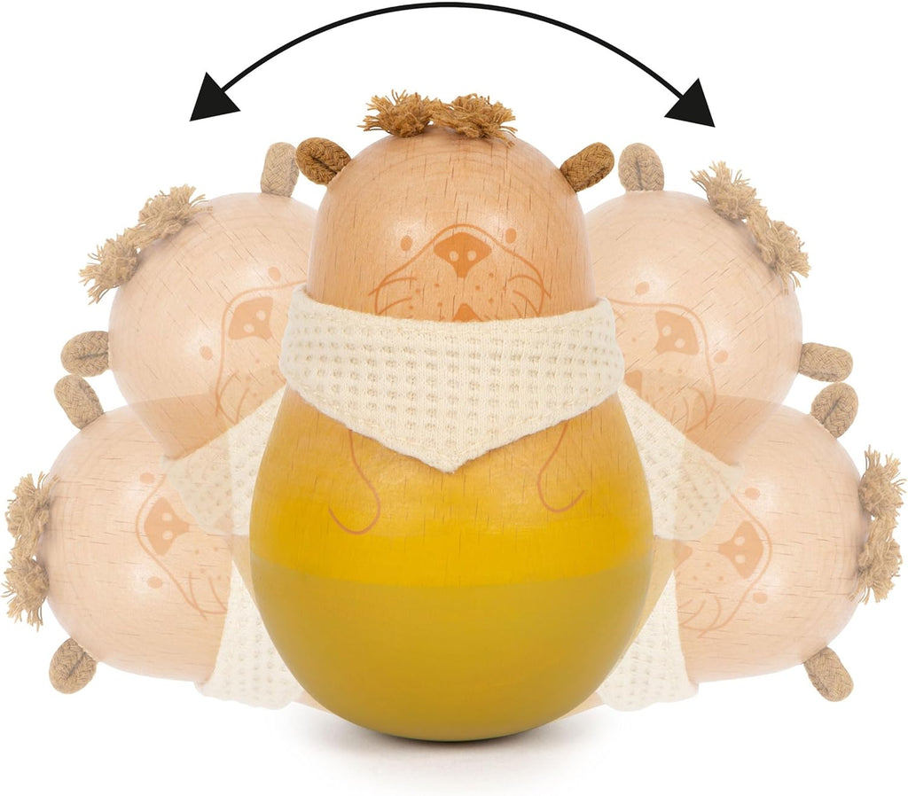 Der hohe sichtbare Holzanteil, die natürliche Gestaltung und die modernen Farben machen das Stehaufmännchen zum idealen Geschenk für Neugeborene