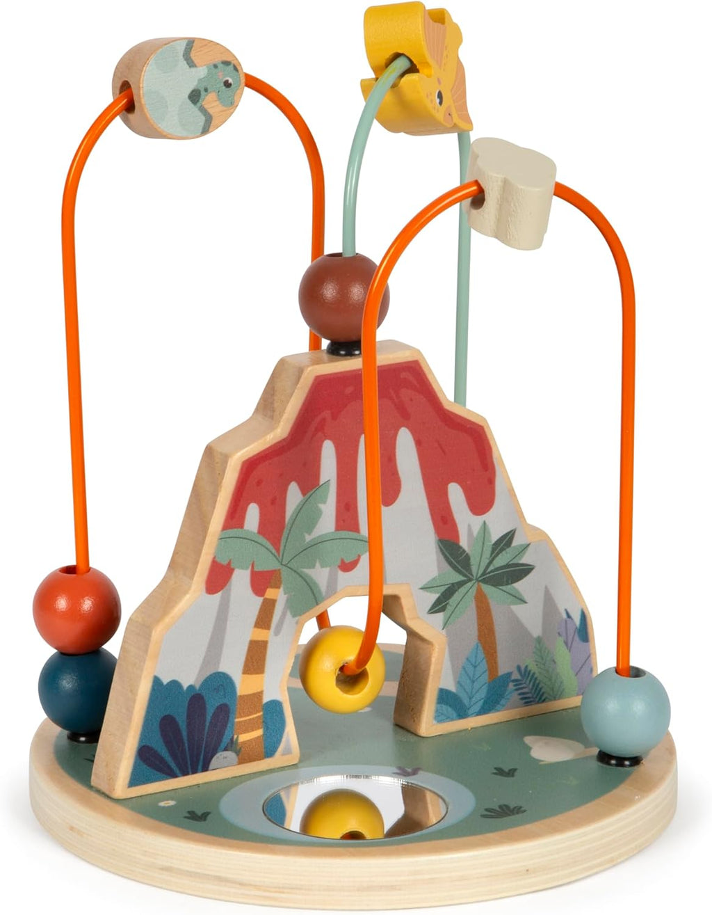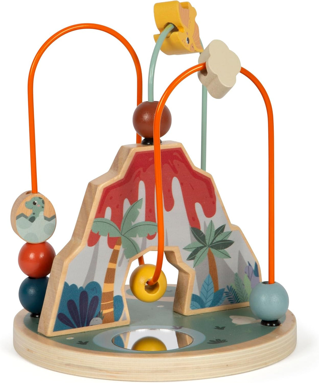 - Zwei Metallschleifen mit Holzperlen in verschiedenen Farben sowie zwei Schiebeelementen mit Dinosaurier-Druck sorgen für langanhaltende Beschäftigung