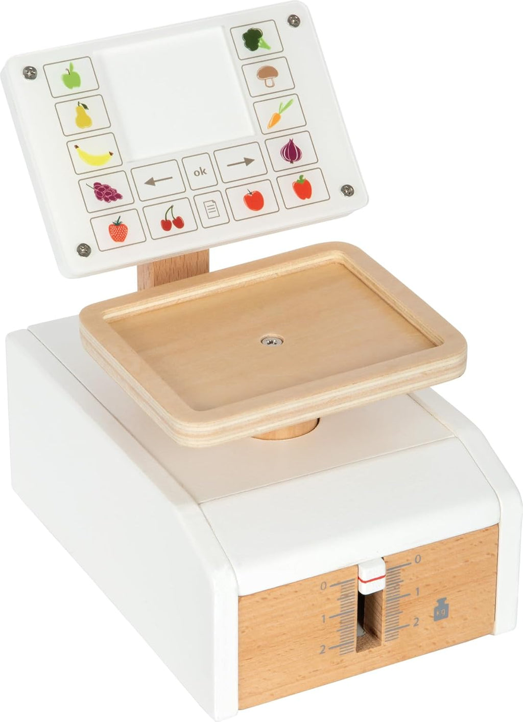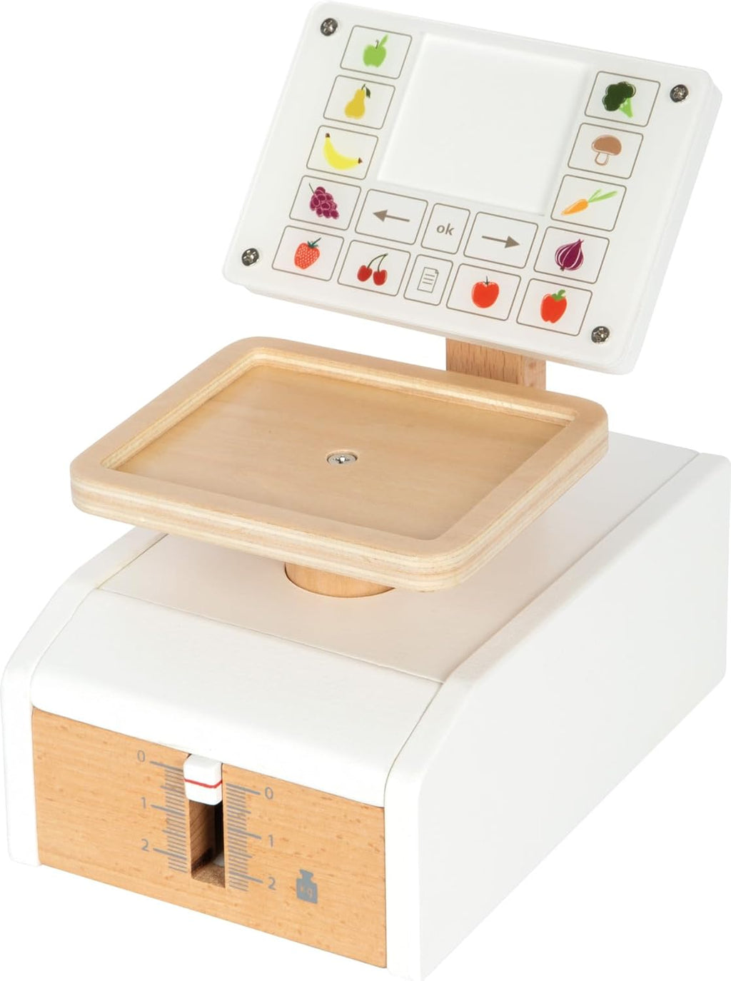 Spielwaage mit extra großer Waagschale und 6 Lebensmittel-Karten, die beidseitig mit Obst- und Gemüse-Abbildungen bedruckt sind