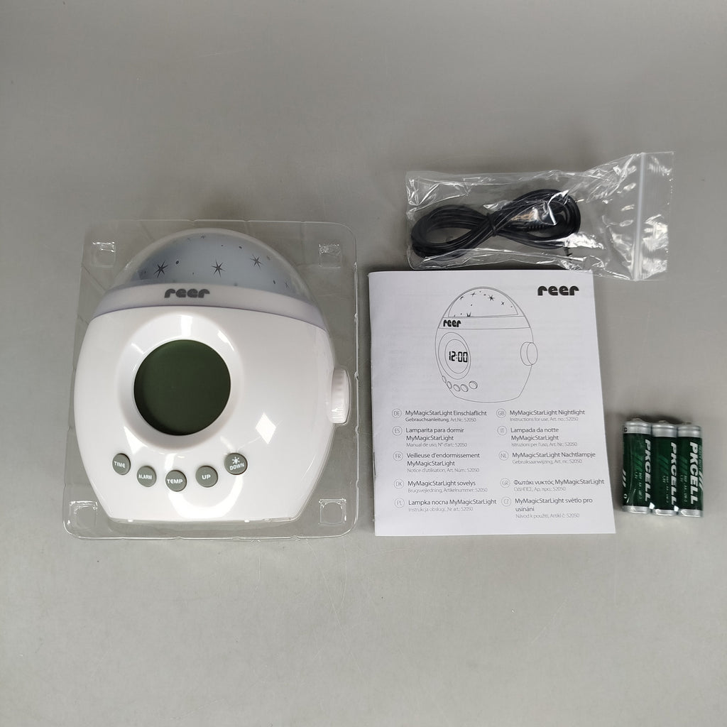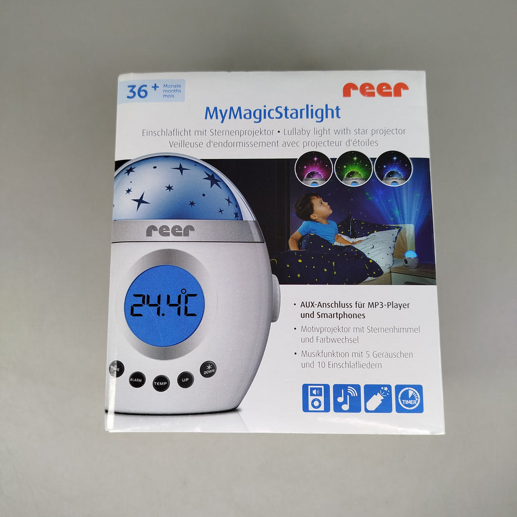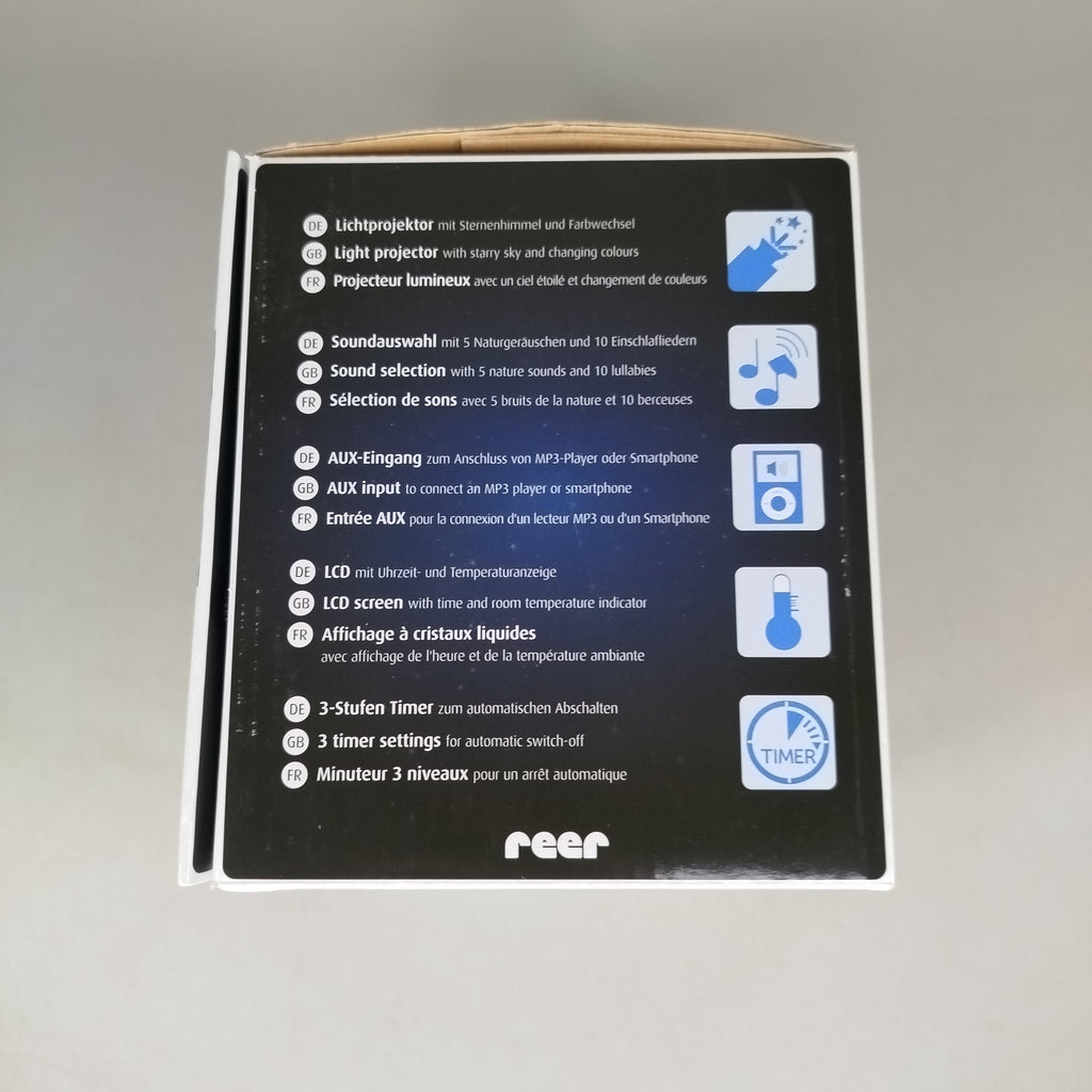 Hol dir das Reer MyMagicStarlight Nachtlicht und schaffe eine beruhigende Atmosphäre im Kinderzimmer. Das Gerät projiziert einen farbwechselnden Sternenhimmel, spielt fünf Naturklänge und zehn Schlaflieder ab und zeigt auf dem LCD-Display Uhrzeit und Raumtemperatur. Es verfügt über drei Timerfunktionen und einen AUX-Eingang für MP3-Player oder Smartphone. Mit Originalverpackung, Anschlusskabel, Anleitung und Batterien. Das Nachtlicht ist in sehr gutem gebrauchten Zustand und vollständig. Hinweis: Nicht für Kinder unter 3 Jahren geeignet, da Kleinteile verschluckt werden können.