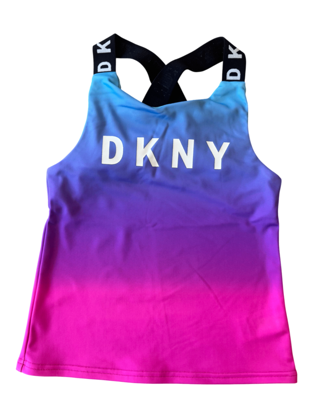 Dieses schicke Kinder-Secondhand-Sporttop von DKNY ist ein echter Blickfang und bietet Komfort und Stil in einem. Mit seinem auffälligen Farbverlauf von Blau zu Pink ist dieses Oberteil perfekt für aktive Mädchen, die gerne sportlich unterwegs sind.