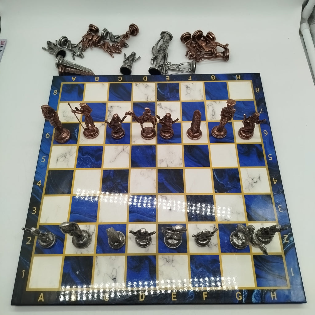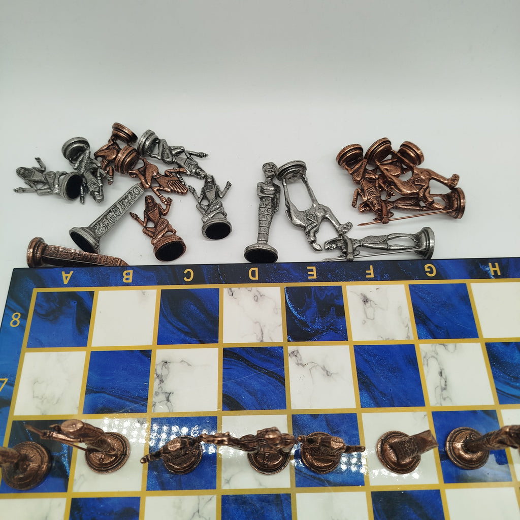 Das Schachspiel im Ägypten-Design bietet ein Schachbrett in Marmoroptik mit den Spielfeldern A–H und 1–8. Die 32 Spielfiguren sind im altägyptischen Stil gestaltet und umfassen Pharaonen, Königinnen, Obelisken, sitzende Figuren sowie Krieger auf Kamelen. Schach fördert strategisches Denken und Konzentration. Altersempfehlung: 10–13 Jahre. Nicht für Kinder unter 3 Jahren geeignet, da Kleinteile verschluckt werden können.