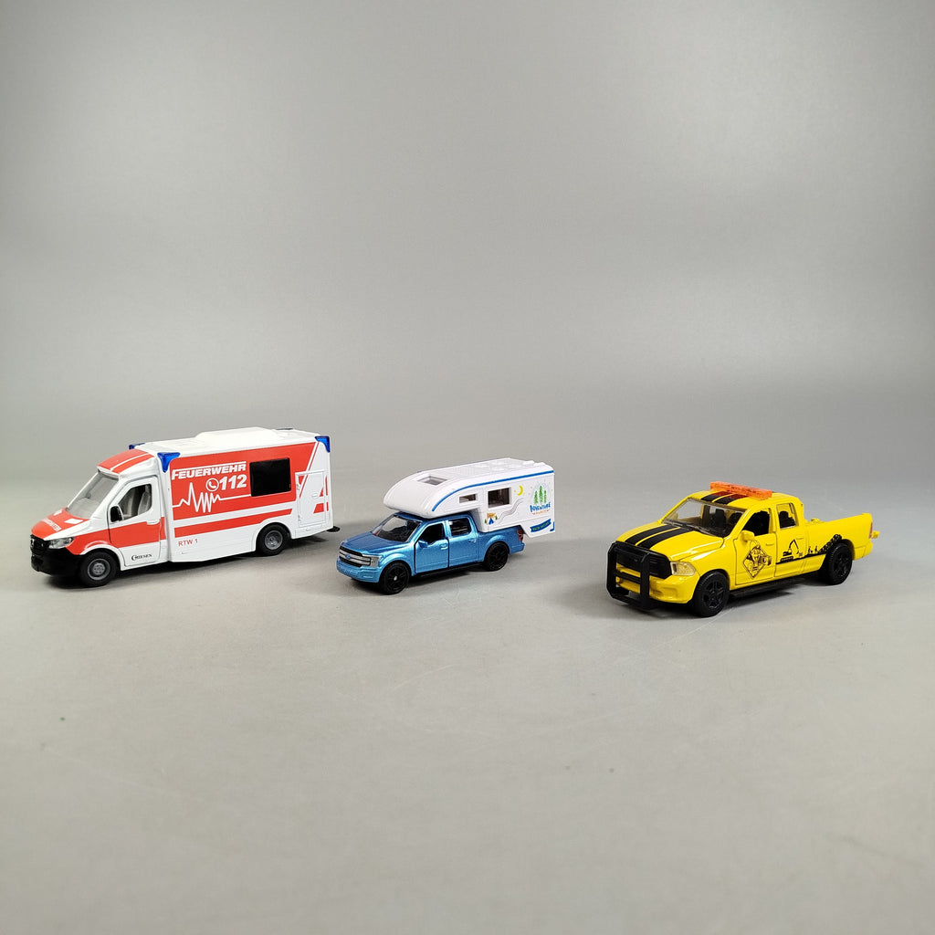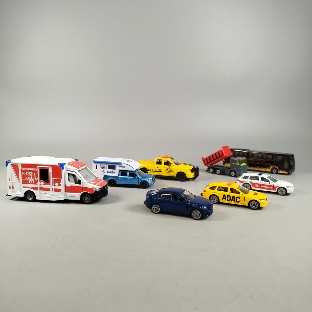 Hol dir das Siku Fahrzeug-Set mit acht detailreichen Miniaturautos und bring Action ins Kinderzimmer! Enthalten sind Rettungswagen, Notarzt-, ADAC- und Feuerwehrfahrzeug, Bus, Wohnmobil, Abschleppwagen, Limousine und Baustellenkipper. Die langlebigen Metallmodelle sind ideal für junge Fahrzeugfans und Sammler. Verpackung fehlt, die Autos befinden sich in sehr gutem gebrauchten Zustand. Gib diesen Spielzeugen ein neues Zuhause und fördere spielerisch Fantasie und Kreativität. Achtung: Nicht für Kinder unter 3 Jahren geeignet, da Kleinteile verschluckt werden können.