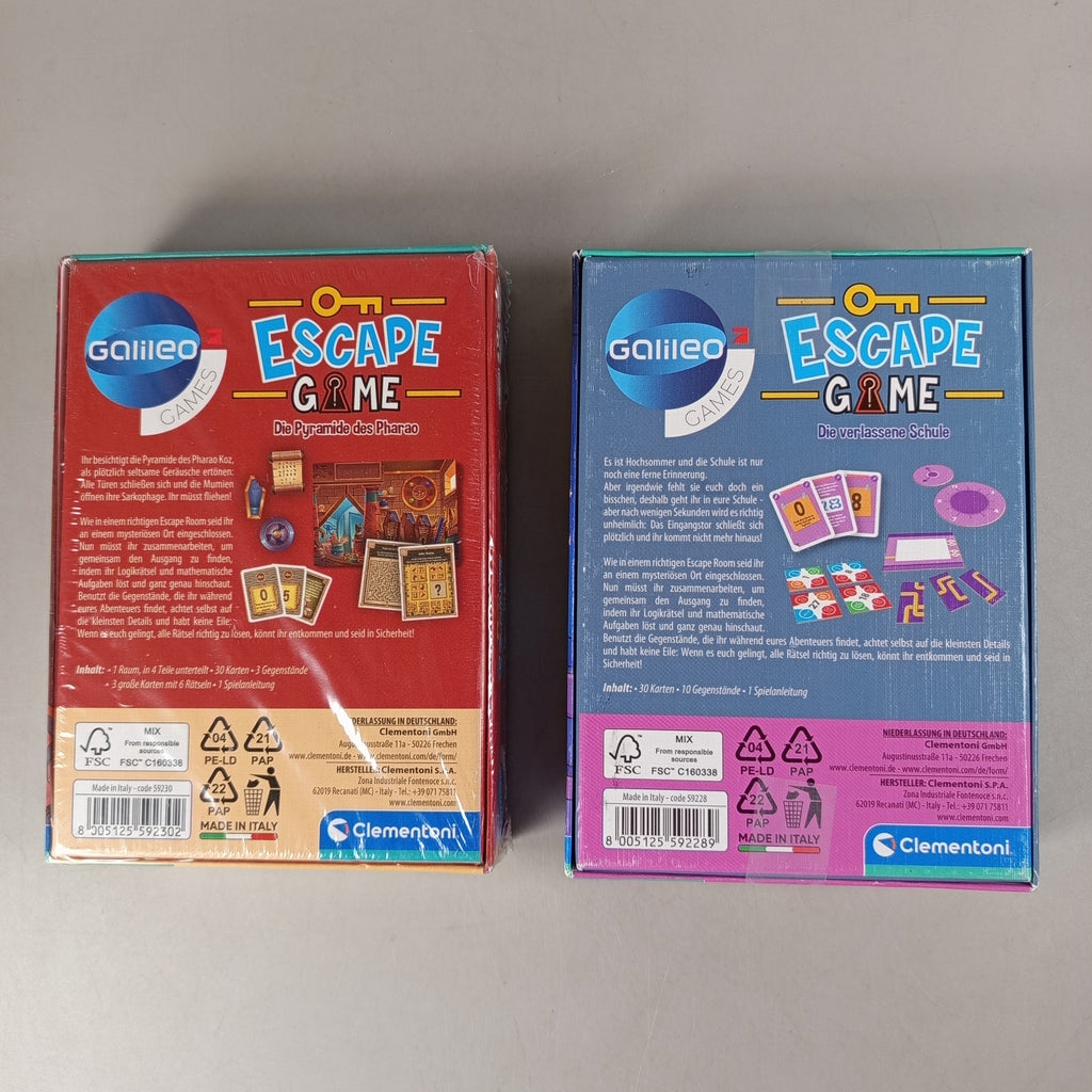 Hol dir das Galileo Escape Game Doppelset von Clementoni mit den spannenden Abenteuern 'Die Pyramide des Pharao' und 'Die verlassene Schule'. Beide Spiele bieten clever gestaltete Rätselräume, Karten und Objekte für 1–6 Spieler ab 8 Jahren. In deutscher Sprache, in Originalverpackung mit leichten Gebrauchsspuren. Die Vollständigkeit konnte nicht überprüft werden. Nachhaltig produziert in Italien mit FSC-zertifiziertem Material. Achtung: Nicht für Kinder unter 3 Jahren geeignet – Erstickungsgefahr durch Kleinteile.