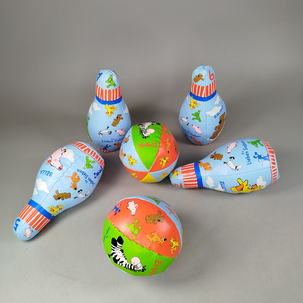 Hol dir das farbenfrohe Soft Bowling-Set mit den Figuren aus 'Die Lieben Sieben' und erlebe spaßige Bowlingrunden im Kinderzimmer. Das Set besteht aus 6 nummerierten Pins mit den Namen OLE, LOTTE, HENRI, IDA, BELLA und BRUNO sowie 2 Bällen, beide mit dem Namen EMMA versehen. Hergestellt aus weichem Material für sicheres Spielen, ideal auch für jüngere Kinder. Das Spielzeug befindet sich in gutem gebrauchten Zustand, leichte Gebrauchsspuren sind vorhanden. Die Verpackung fehlt, die Vollständigkeit konnte nicht überprüft werden. Gib diesem liebevoll gestalteten Spielzeug ein neues Zuhause und genieße nachhaltigen Spielspaß!
