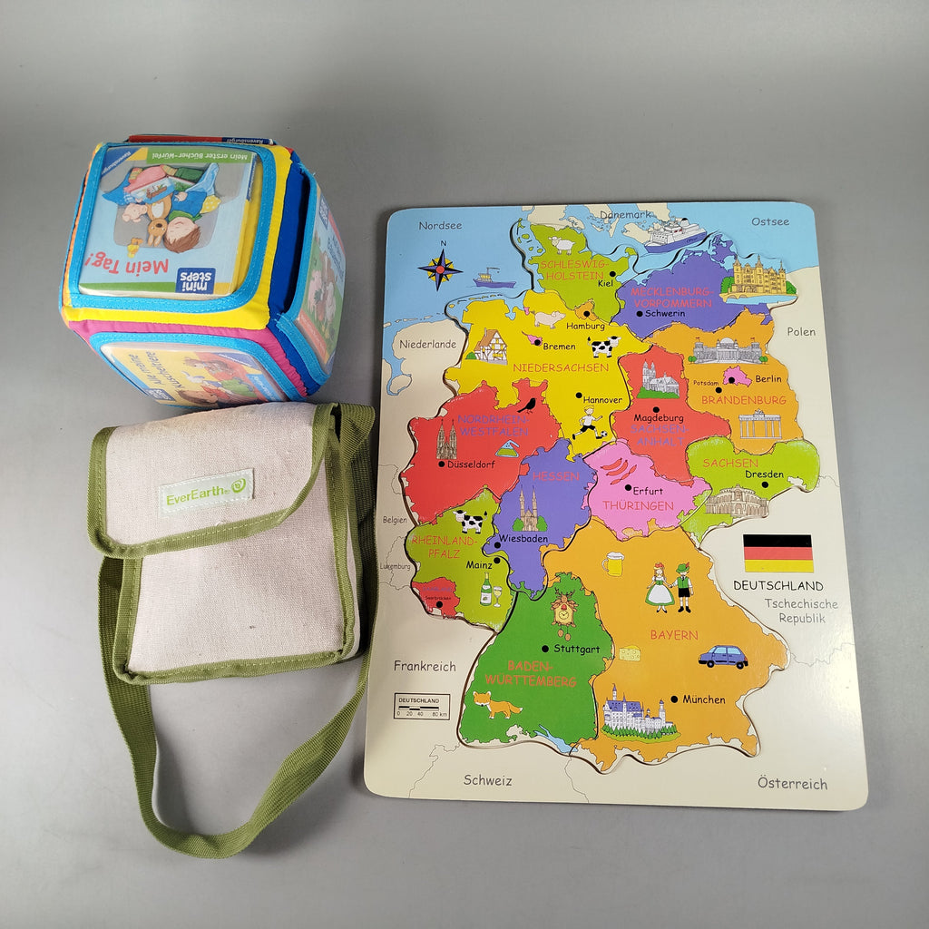 Hol dir das vielfältige Spieleset mit einem Deutschland-Holzpuzzle, einem Stoffwürfel von mini steps und einem EverEarth® Spielset mit Kameraspielzeug und Tasche. Ideal zum Lernen und Entdecken. Gebraucht, in sehr gutem Zustand. Die Vollständigkeit konnte nicht überprüft werden. Gib diesen Spielsachen ein neues Zuhause und fördere spielerisch Wissen und Kreativität.