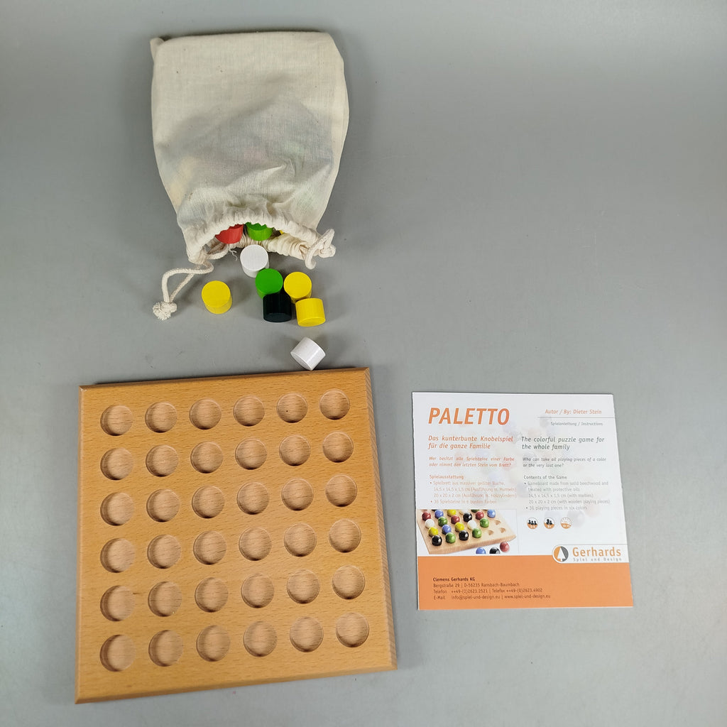 Hol dir das strategische Brettspiel Paletto von Gerhards Spiel und Design und erlebe spannenden Spielspaß für die ganze Familie. Das hochwertige Holzspiel enthält ein Spielfeld mit 36 runden Feldern sowie farbige Spielsteine im Stoffbeutel. Ideal für Logikliebhaber und Puzzlefreunde. Das Spiel befindet sich in einem sehr guten Zustand und ist vollständig. Verpackung ist original vorhanden, die Anleitung fehlt. Sieger des Deutschen Lernspielpreises 2012 (Leserpreis). Gib diesem besonderen Spiel ein neues Zuhause und entdecke seine nachhaltige Holzqualität!