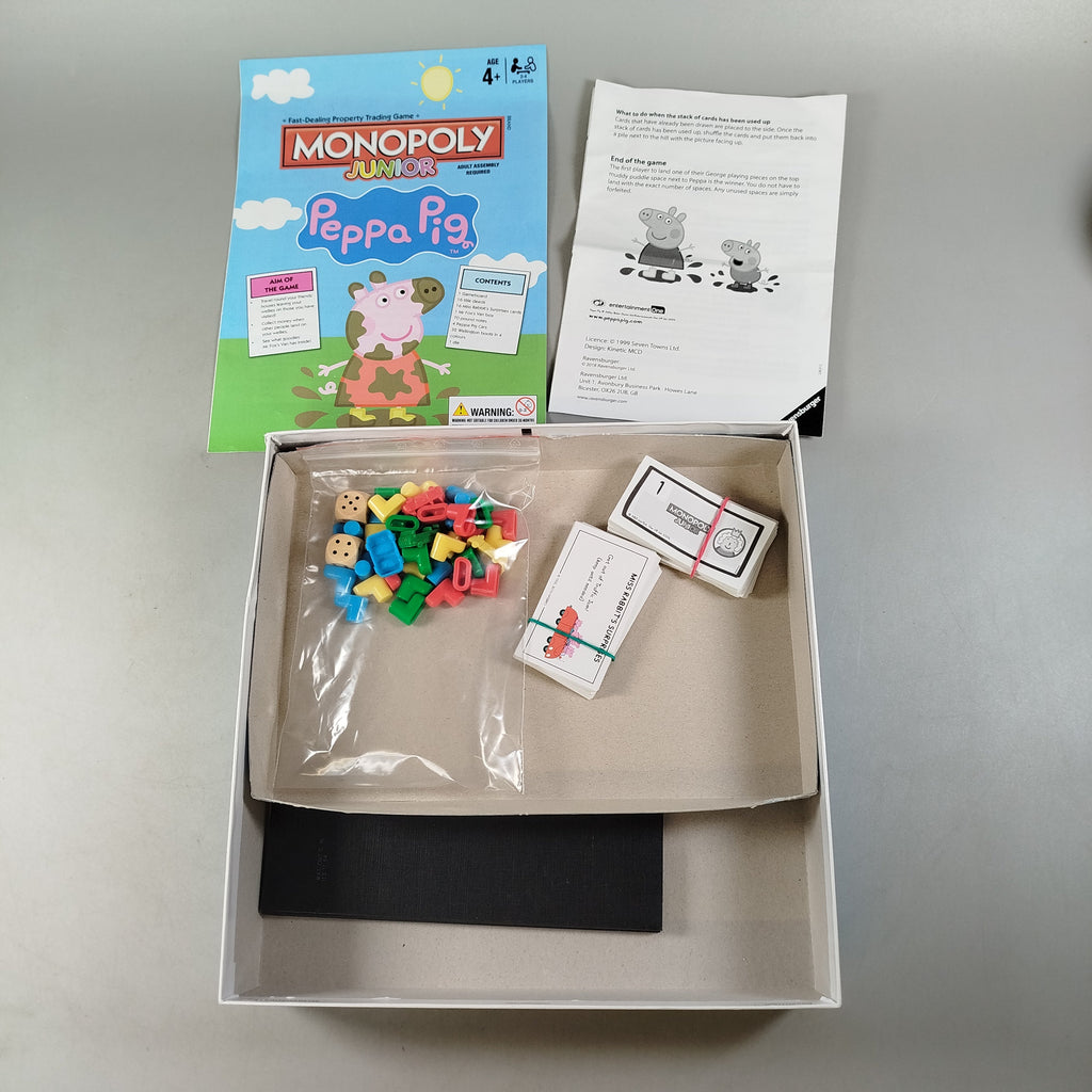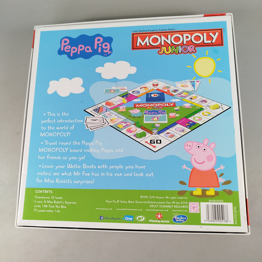 Hol dir das witzige Monopoly Junior Peppa Pig Spiel und bring Spaß ins Kinderzimmer! Dieses Spiel enthält das detailreich gestaltete Peppa-Pig-Spielbrett, 32 Stiefel, 4 Autos, 16 Miss Rabbit’s Überraschungskarten, eine Mr Fox Van Box, 70 Geldscheine und einen Würfel. Es eignet sich für 2–4 Spieler ab 4 Jahren. Das Spiel befindet sich in einem sehr guten gebrauchten Zustand, die Vollständigkeit wurde überprüft und ist vollständig. Verpackung und Anleitung sind enthalten. Hinweis: Nicht für Kinder unter 3 Jahren geeignet, da Kleinteile verschluckt werden können.