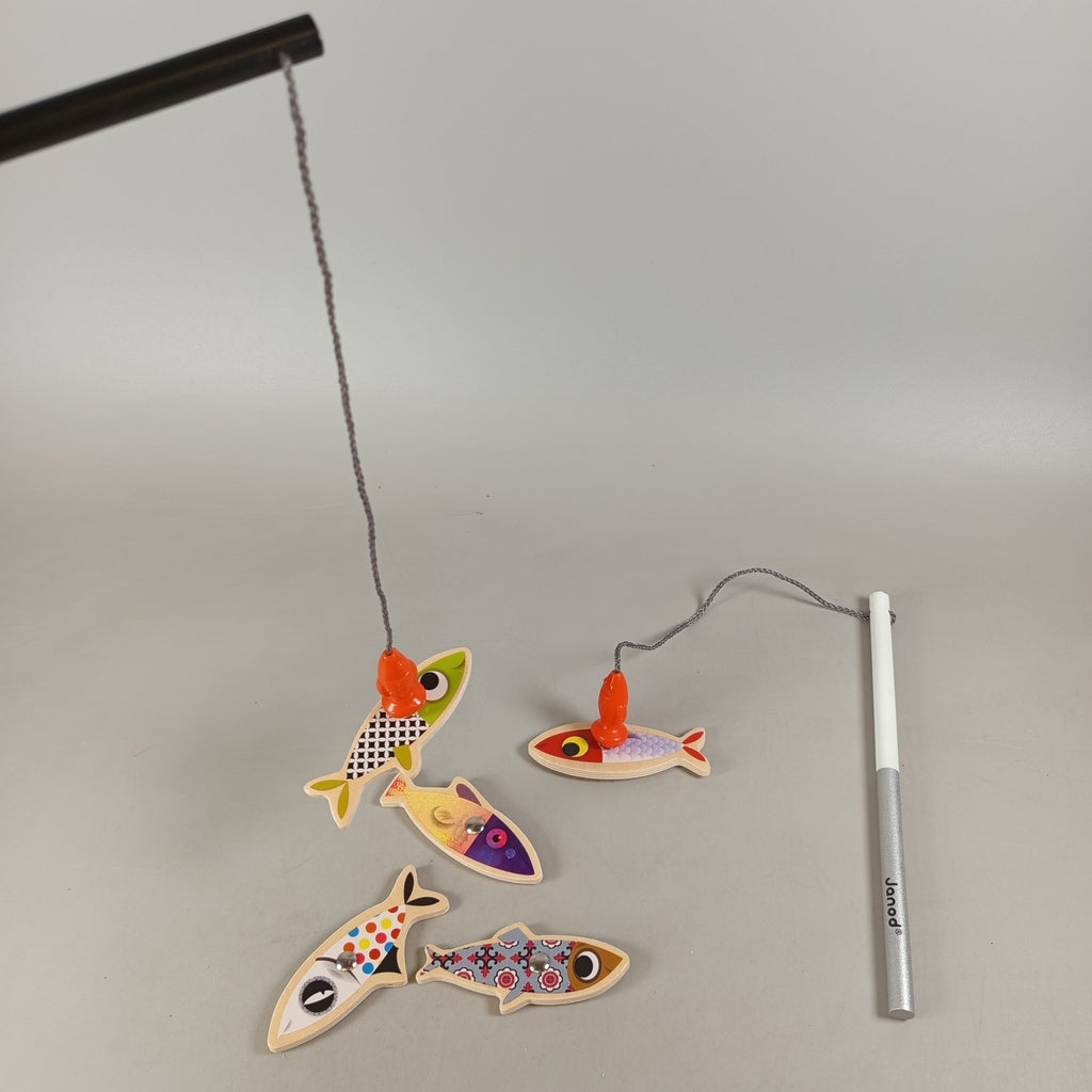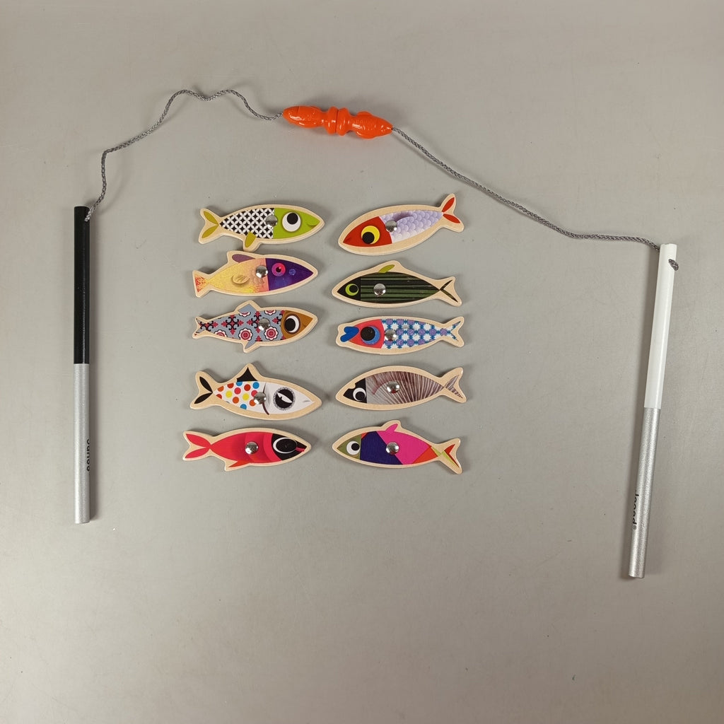 Hol dir das magnetische Janod Angelspiel und erlebe Spaß beim Fischen! Das Spiel enthält 10 bunte Holzfische mit Metallösen und zwei magnetische Angelruten. Ideal für 1 bis 2 Spieler ab 2 Jahren, fördert Geschicklichkeit und Konzentration. Das Spiel befindet sich in einem sehr guten gebrauchten Zustand, Vollständigkeit konnte nicht überprüft werden. Gib diesem Holzspiel ein neues Zuhause und spiele nachhaltig!