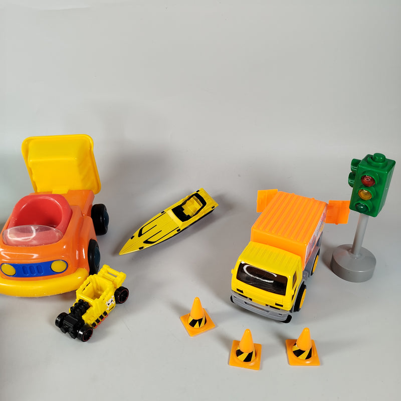 Dieses farbenfrohe Fahrzeug-Spielset umfasst eine Vielzahl von Spielzeugen, die für kreatives Spielen und Rollenspiele geeignet sind. Enthalten sind ein Traktor mit Anhänger, ein Bagger, ein Auto mit aufklappbarem Kofferraum, ein Lieferwagen, ein kleines Rennboot und ein Mini-Bulldozer. Zusätzlich sind Zubehörteile wie Verkehrskegel und eine Ampel enthalten. Ideal, um Kinder in die Welt der Fahrzeuge einzuführen und fantasievolle Szenarien zu gestalten.