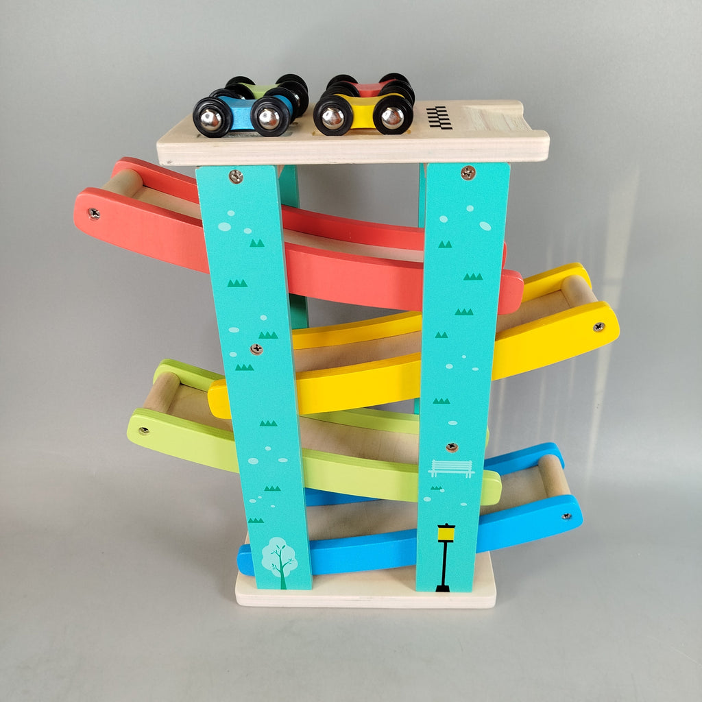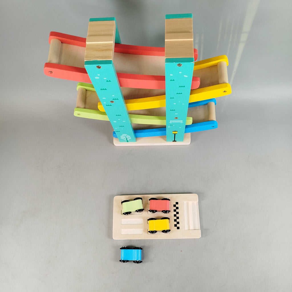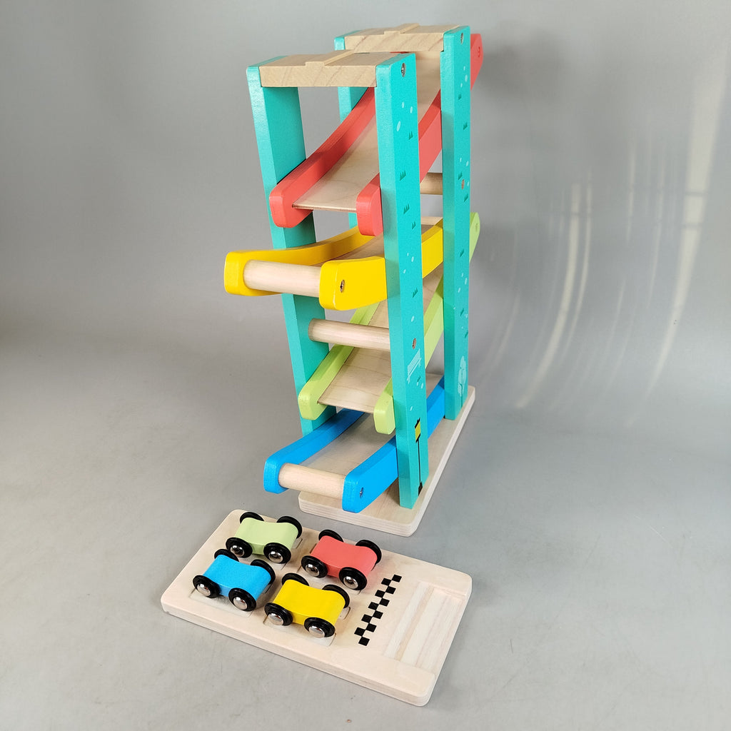 Hol dir die Kugelbahn Autorennbahn aus Holz mit 4 Fahrzeugen und bring Bewegung ins Kinderzimmer! Die mehrstufige Rennbahn mit vier farbigen Strecken, Parkplatz-Basis und 4 kleinen Holzautos sorgt für rasante Abfahrten und fördert spielerisch Motorik sowie das Verständnis von Ursache und Wirkung. Gib diesem Spielzeug ein neues Zuhause. Für Kinder ab 1 Jahr geeignet. Hinweis: Enthält Kleinteile, nicht für Kinder unter 3 Jahren geeignet. Erstickungsgefahr gemäß GPSR.